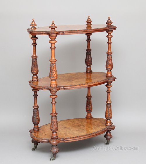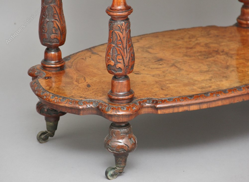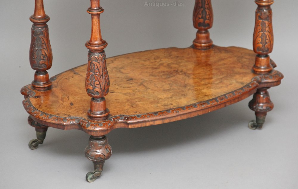 19th Century three tier burr walnut whatnot, with nice decorated inlay on the top tier, each tier with a nicely carved moulded edge, the three tiers supported by turned and carved columns, with each column finished with turned finials, standing on turned feet with brass castors.
