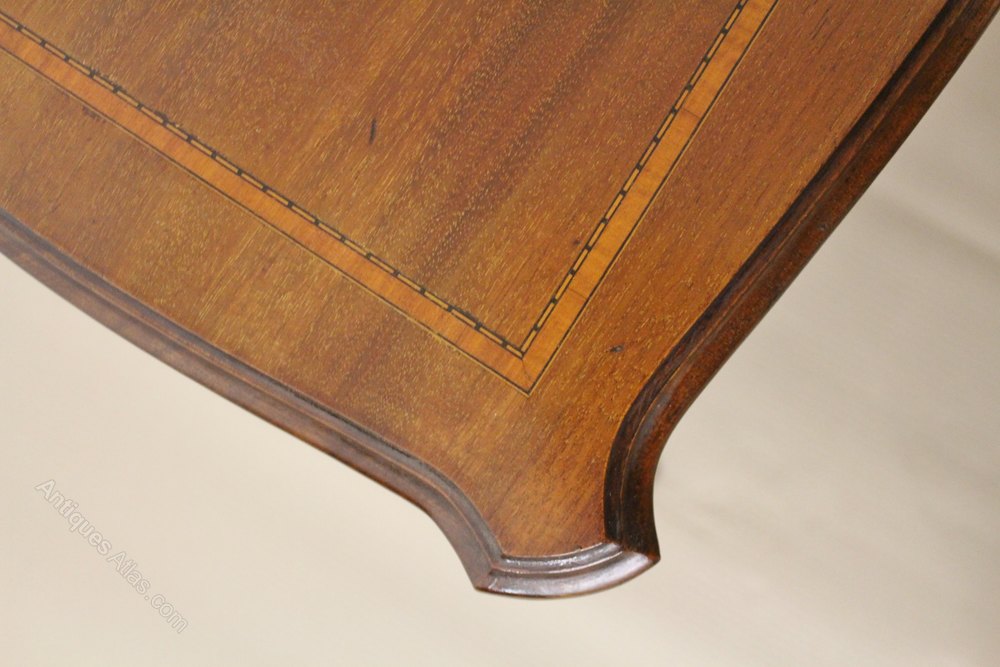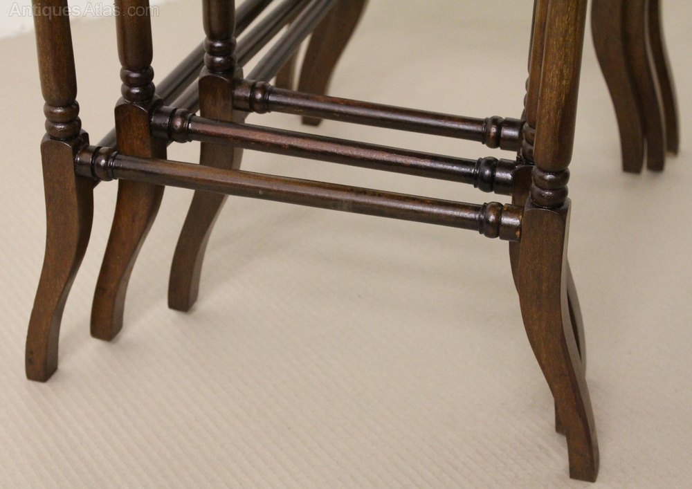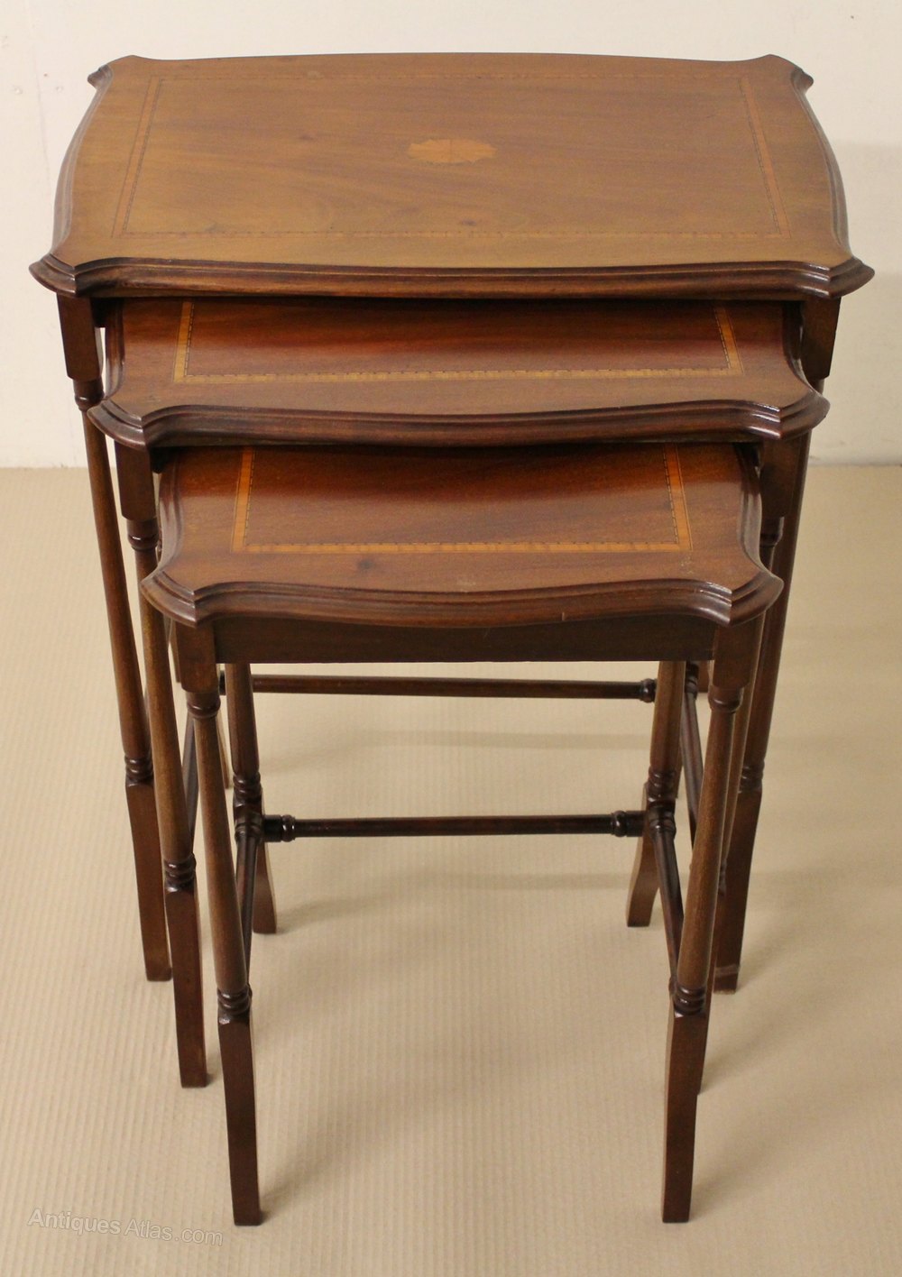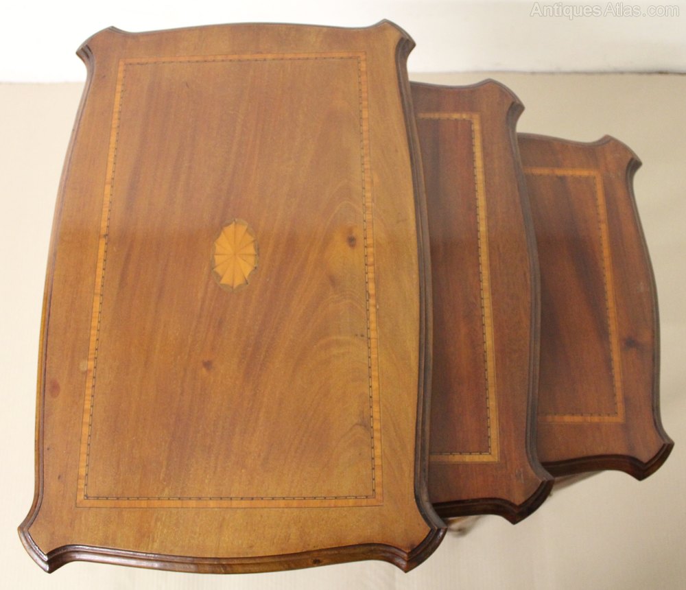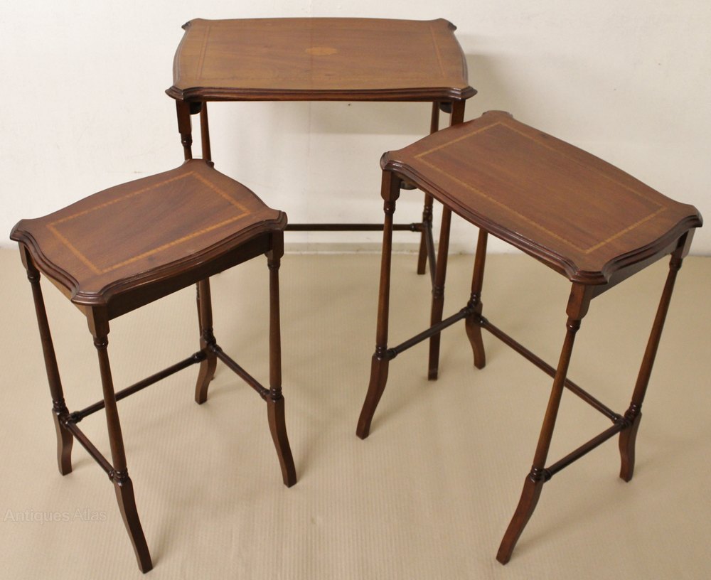 A lovely Edwardian period nest of 3 graduated tea antique tables. Made in solid mahogany with shaped tops and decorated with inlaid detailing , including a central fan motif. This practical and attractive nest of antique tables are offered for sale in excellent original condition.
