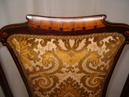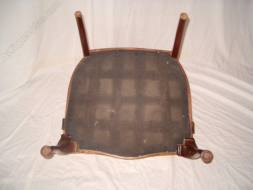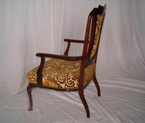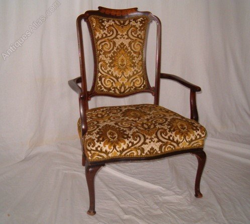 A very nice elegant Edwardian nursing, or occasional, chair attractively inlaid with scrolling to the back. The chair has a serpentine front, wide elbows, and sits on cabriole legs with pad feet.