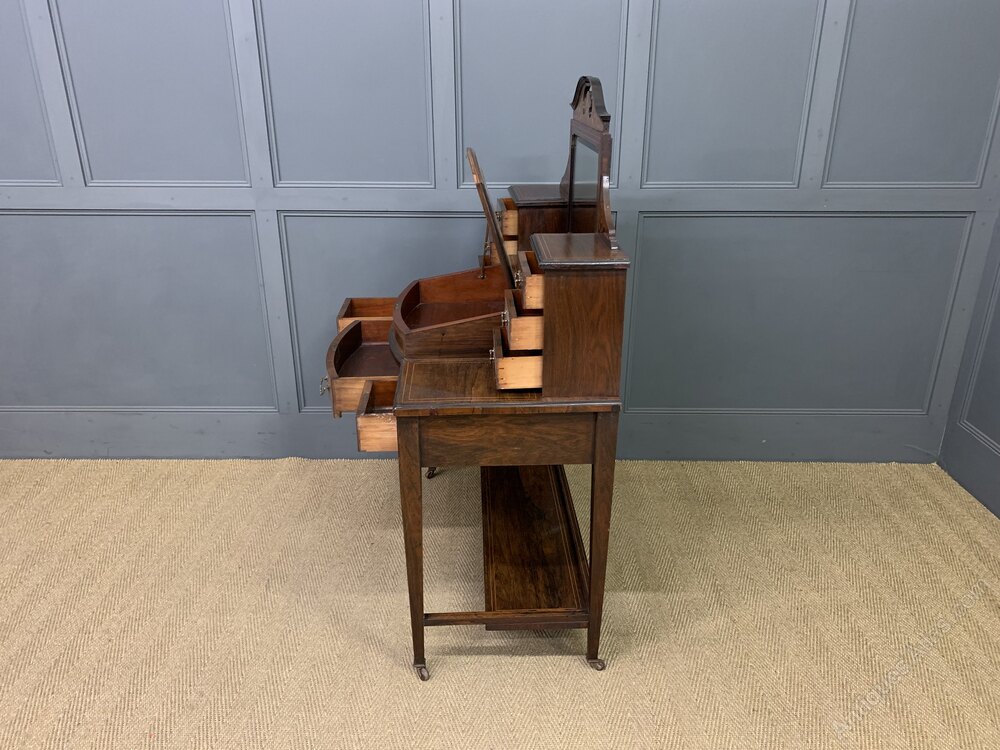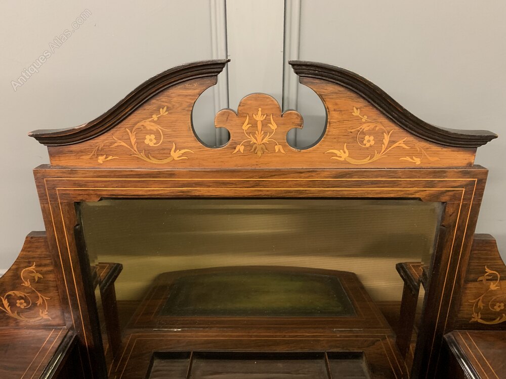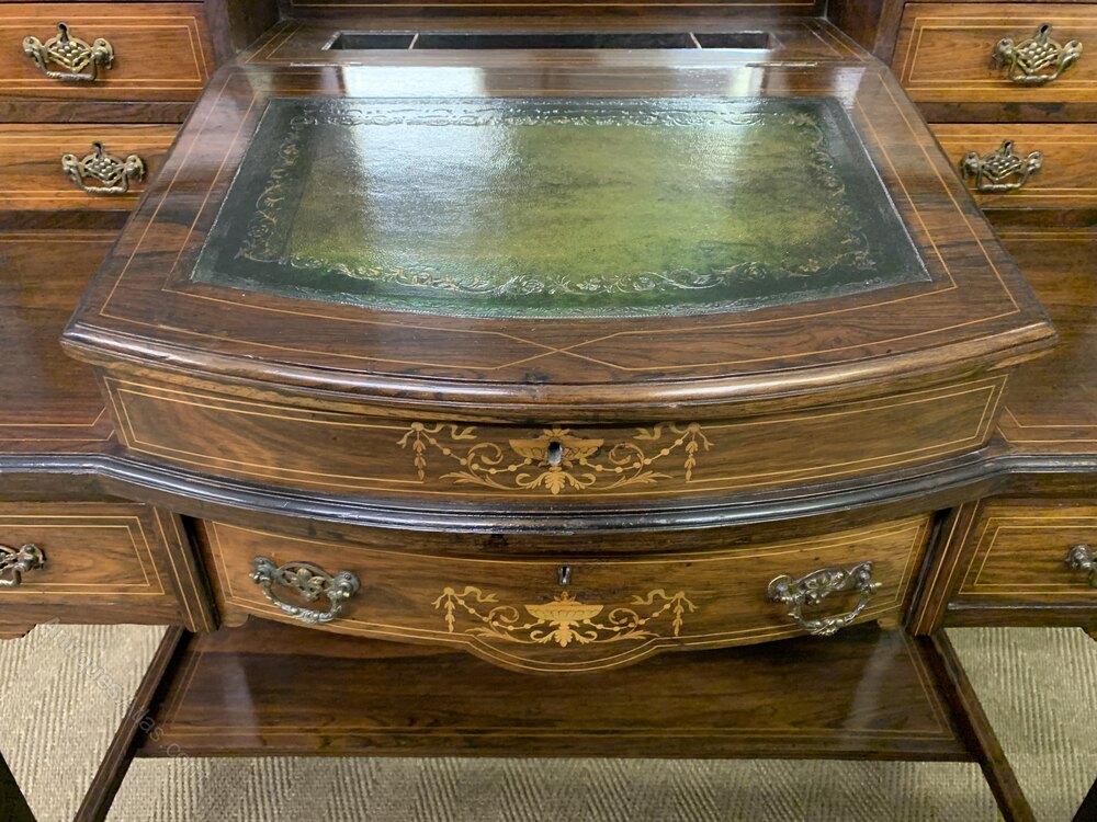 A late Victorian period inlaid rosewood bonheur du jour, or writing desk. Well constructed in solid rosewood with attractive rosewood veneers. The superstructure with a central mirror flanked by 2 banks of short drawers. The mirror is surmounted by a broken-arch pediment. To the table there is a central writing bureau, with a lift up top fitted with a sumptuous green leather writing surface. Beneath is located a central bow-fronted drawer flanked by a further pair of drawers. All drawers fitted with their original ornate handles. All standing on elegant tapering legs which are united by an under-tier and terminate in original brass and ceramic castors. Decorated with inlaid string throughout and further embellished with floral marquetry inlaid detailing. Sympathetically refinished in our workshops and now offered for sale in excellent condition.