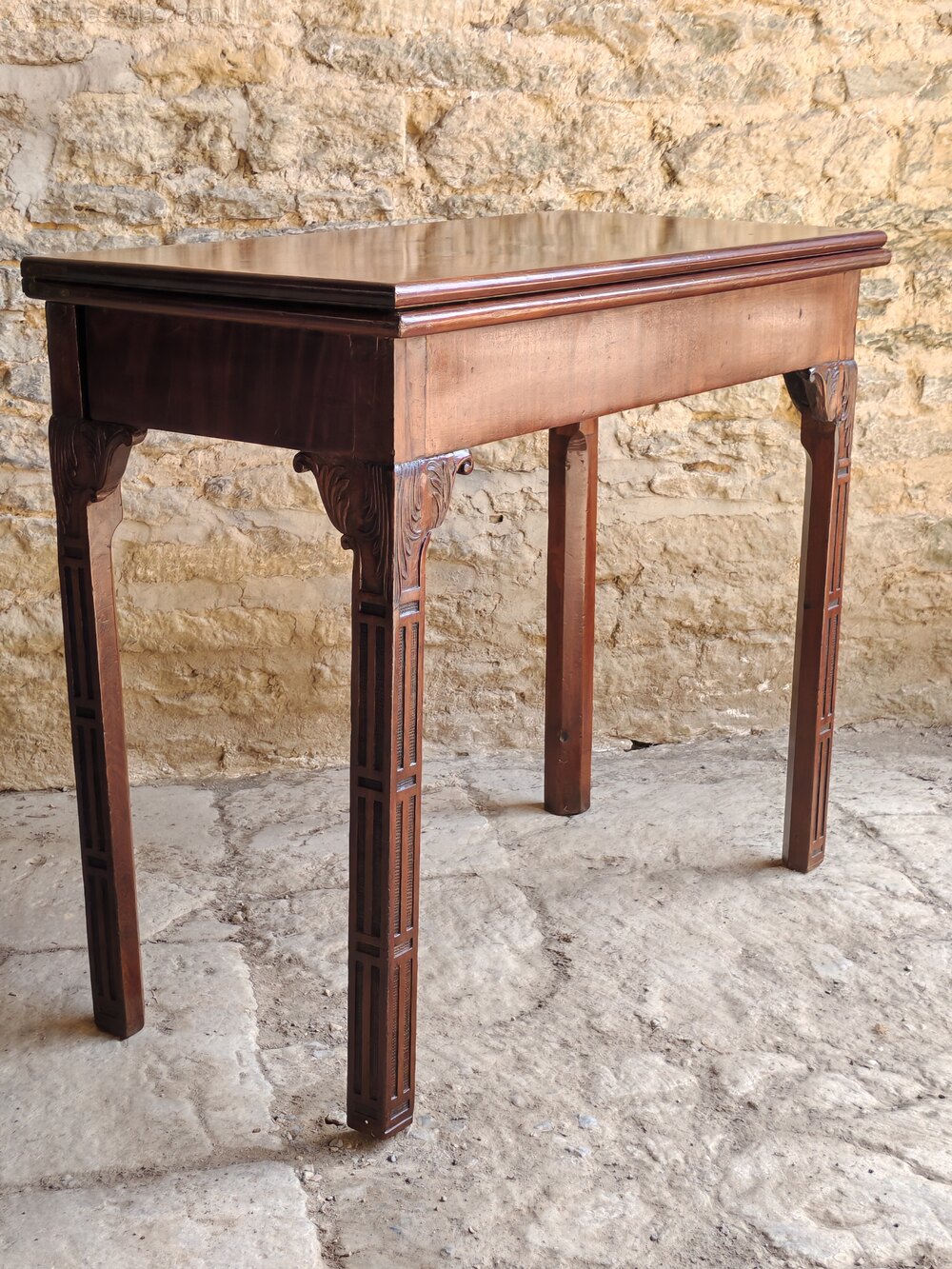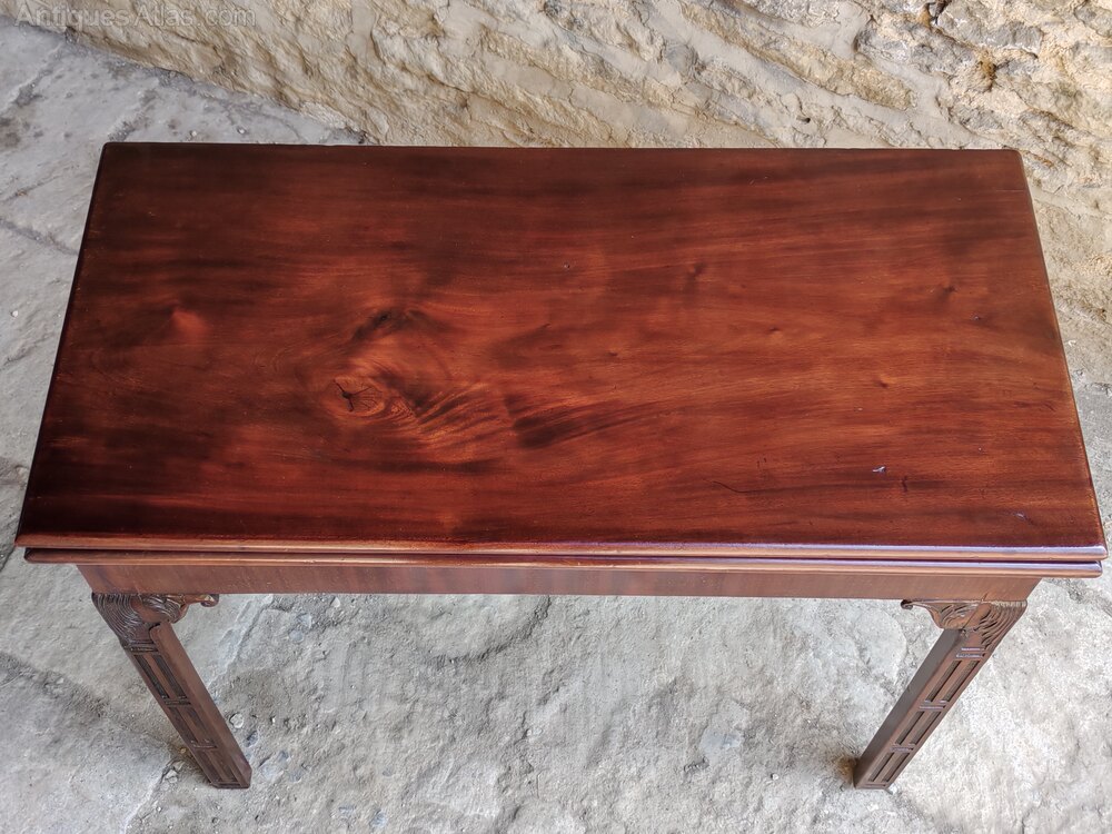 An unusual, Irish mahogany card table in the Chinese Chippendale style. With carved and chamfered legs and green baize interior. This beautiful table could be used as a side table or opened up and used as a games table as intended.
