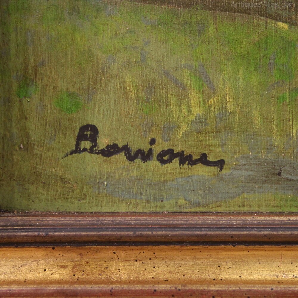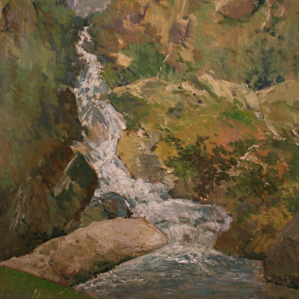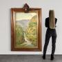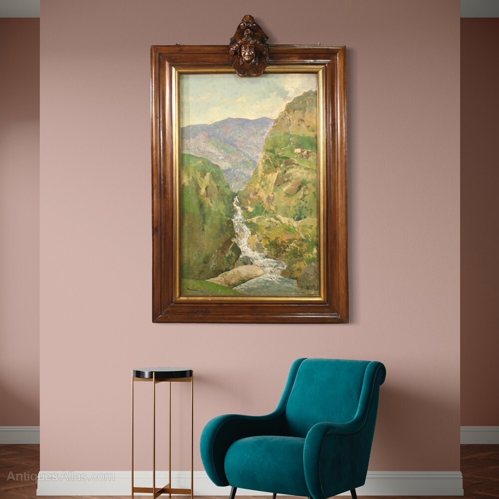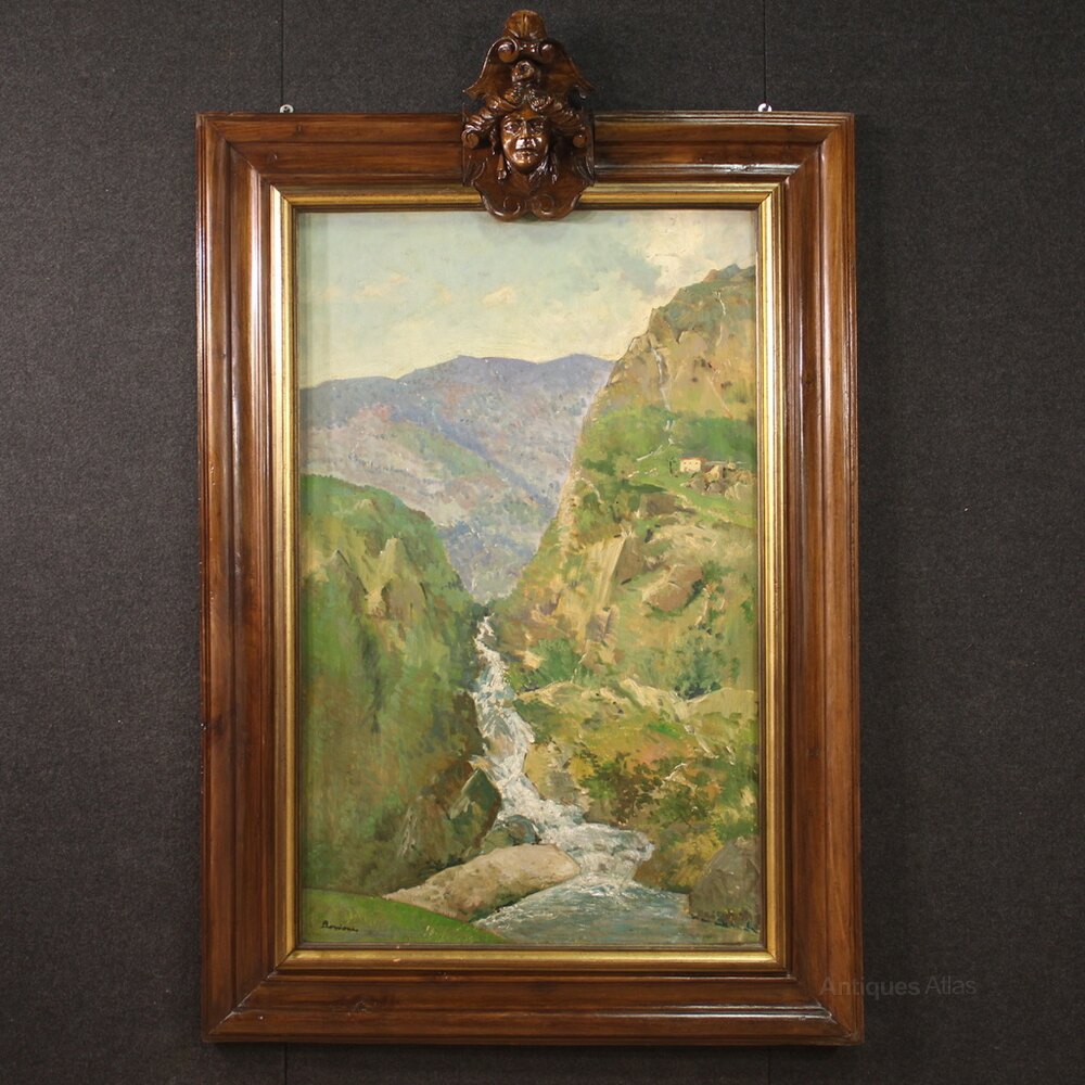 Great Italian painting from the mid-20th century. Oil on board artwork depicting a mountain landscape with river and impressionist-style houses. Painting of exceptional size adorned with a wooden frame with upper mask and golden border (see photo). Good luminosity painting, signed on the bottom left (see photo), signature under study. Artwork of great impact and pleasant decor, ideal for a living room or studio, for antique dealers and interior decorators. In good condition. Sight size H 135 x W 85 cm.