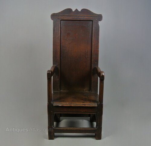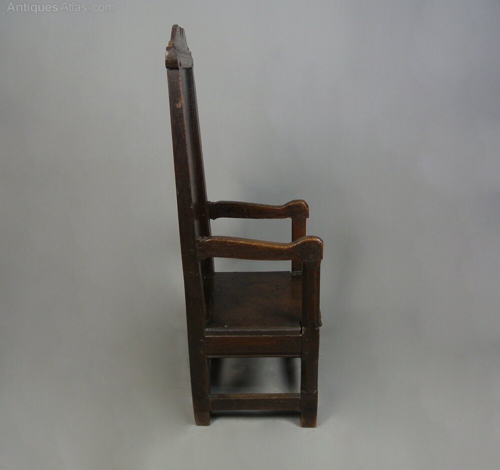 Great chairs were expensive high status items, treasured and kept within families for generations. Only a few wainscot chairs were made for children and they are rare. Rarer still is a child’s Great chair with the exaggerated high back and extended crowning crest rail. This chair may have been made as a smaller and unadorned version of the Master’s chair. Examples of early children’s wainscot chairs are well documented and most reside in museums and private collections. Children’s chairs had a seat height of around 13 inches and here the seat height is 13.5 inches.