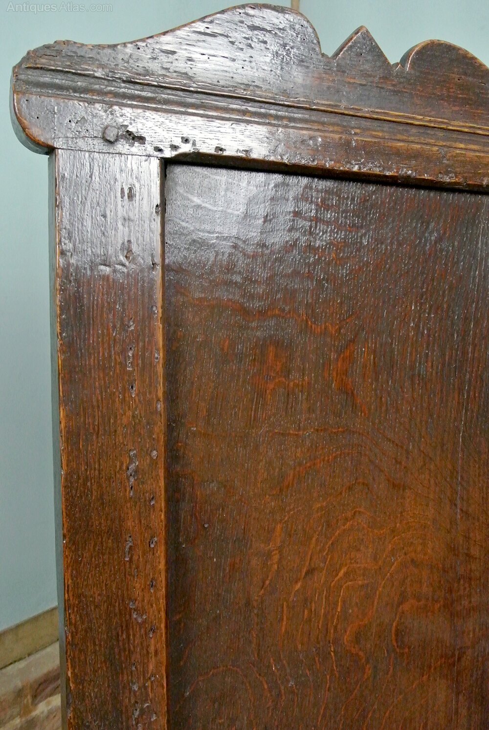 Solid oak original timbers with a single board forming the fielded back panel and another board forming the seat. The front edge of the seat with ogee detail and natural wear and deep patina from generations of use. The top of the back rail and base of the backboard and base of arms each also with ogee carved detailing.