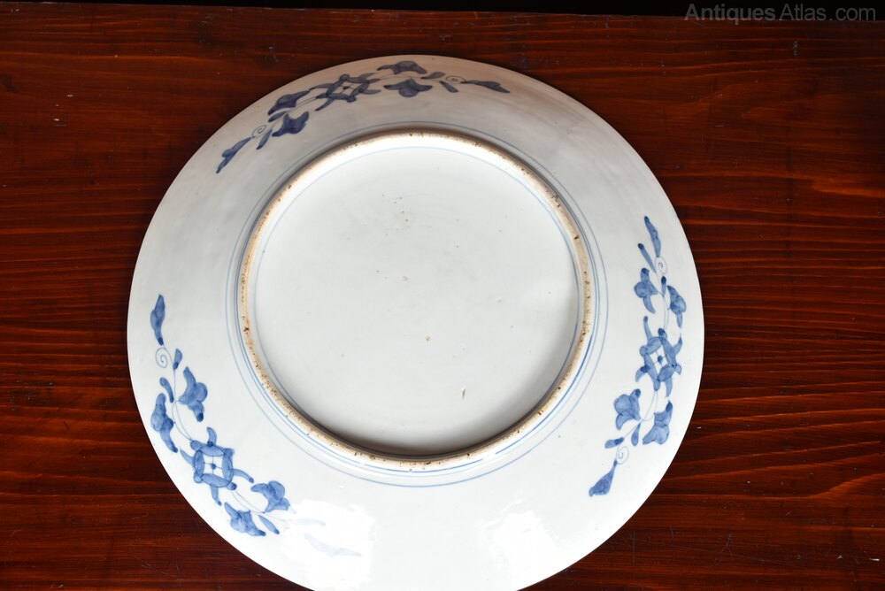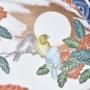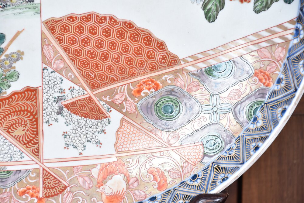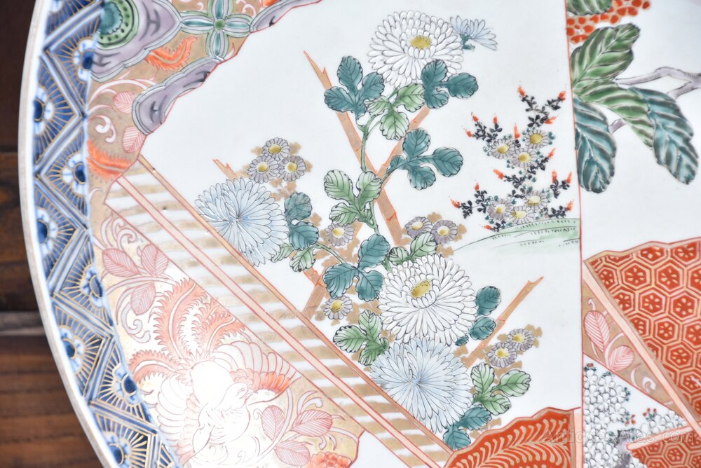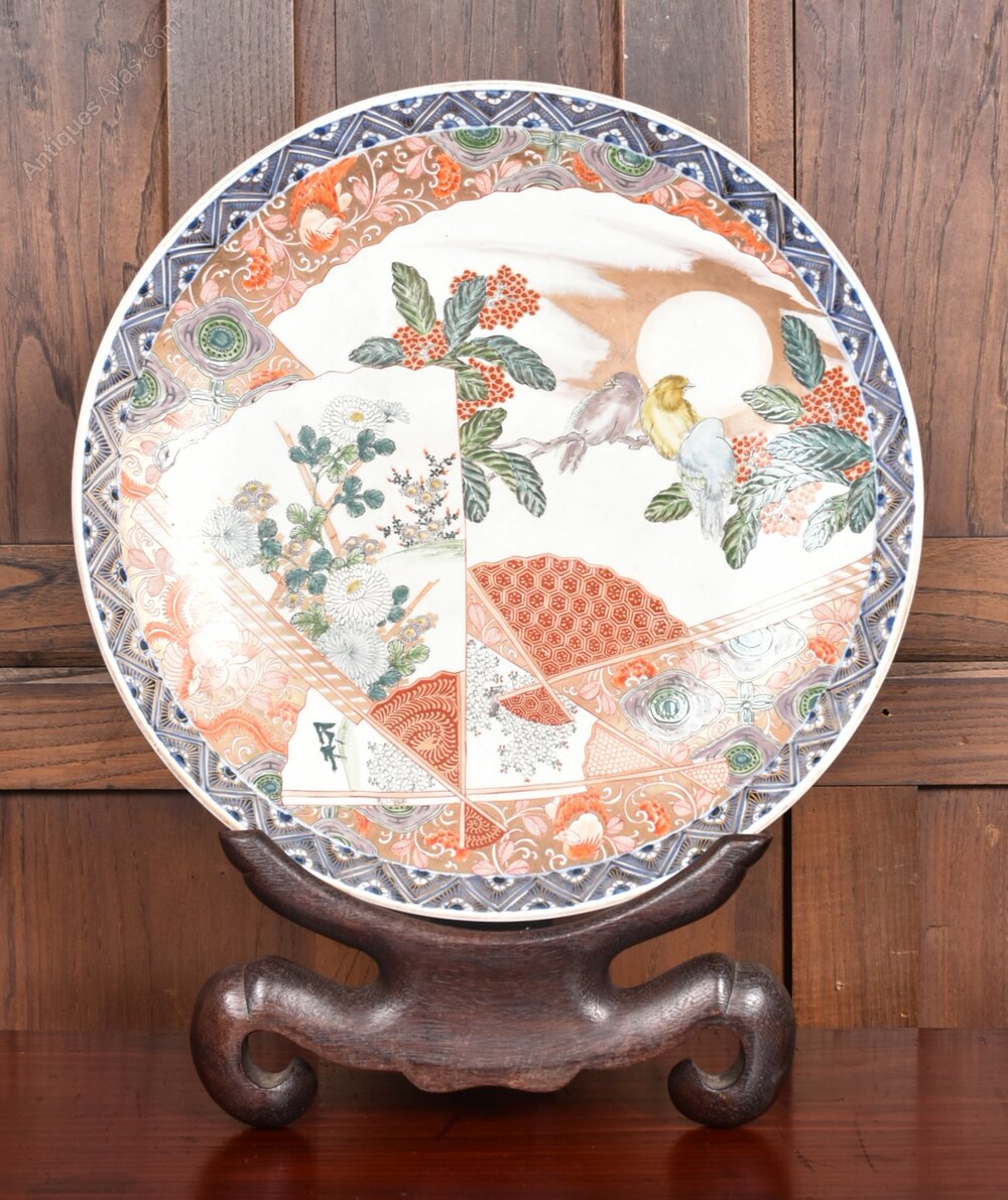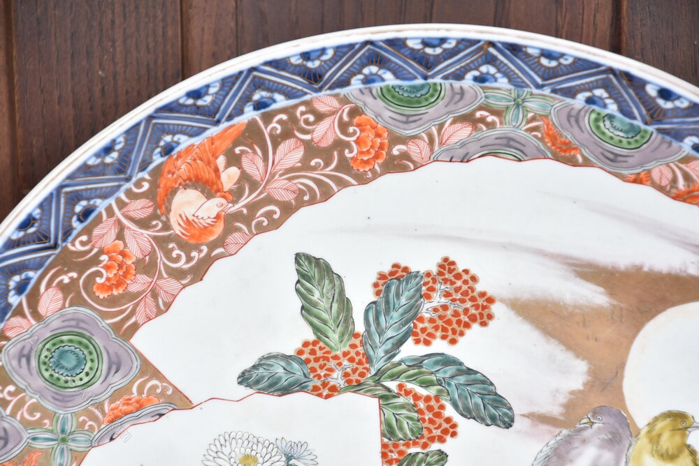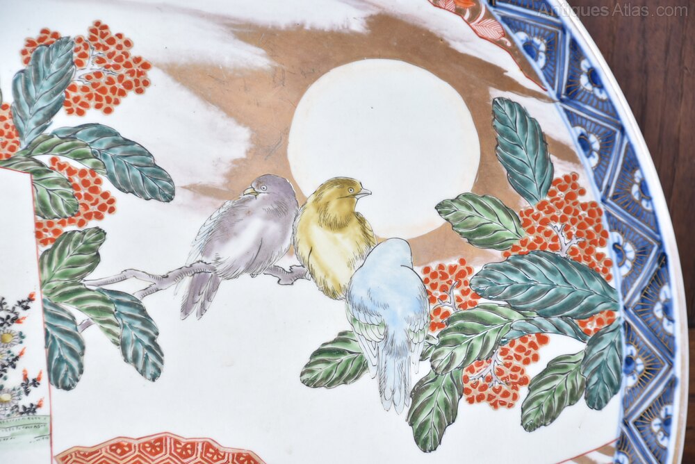 A superb Japanese Imari charger, richly adorned with traditional motifs and vibrant colour. The design features two birds poised gracefully on a berry-laden branch beneath a glowing full moon, set alongside blooming chrysanthemums and intricate textile-inspired patterns in warm shades of red and orange. A classic blue-and-white geometric border frames the composition, lending balance and refinement. This piece beautifully captures the elegance and narrative charm of Meiji-period Imari ware, blending natural serenity with bold decorative artistry.
