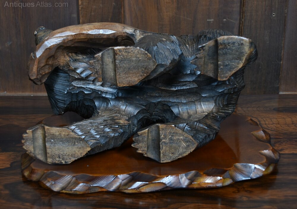 This striking Kibori Kuma sculpture, carved from richly stained wood, captures a bear in mid-stride with a salmon gripped firmly in its jaws—a vivid moment rendered with instinctive energy and natural grace. Rooted in the tradition of Hokkaido woodcarving and originally inspired by Swiss Black Forest motifs, this piece stands as both a cultural artefact and a testament to regional craftsmanship. It rests on a polished wooden base with a scalloped edge, adding refinement and enhancing its visual presence.