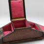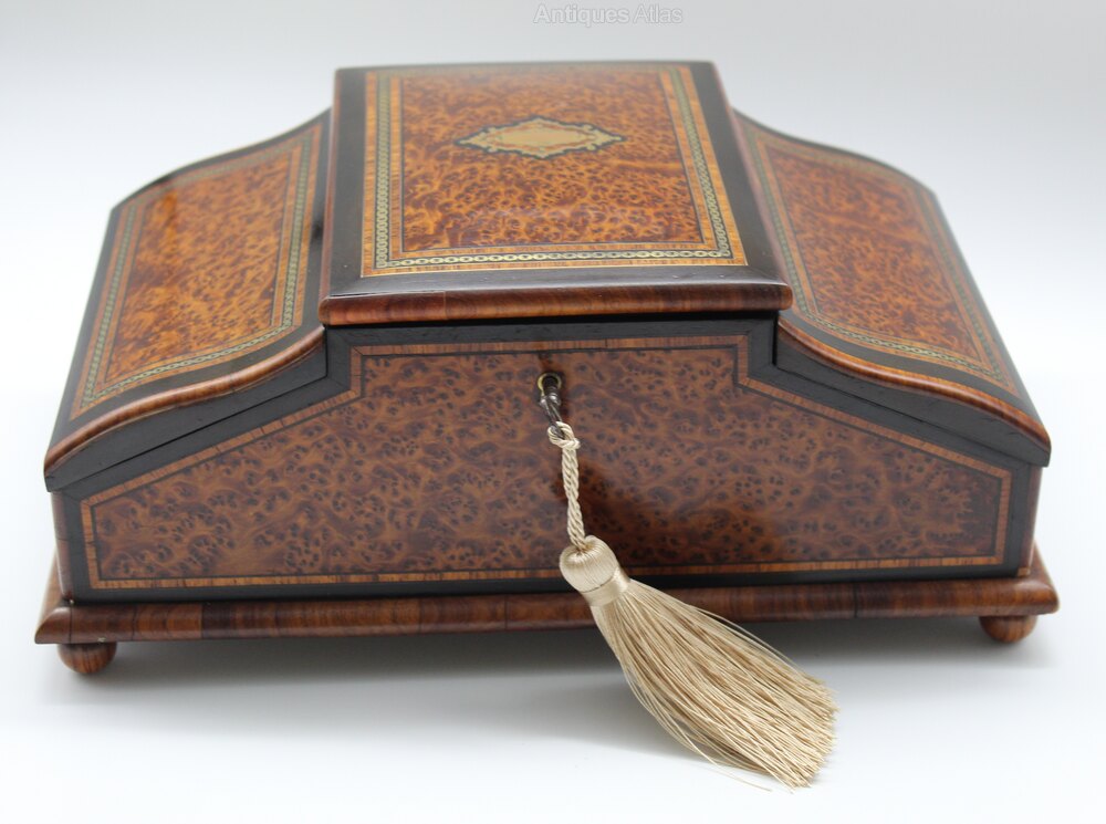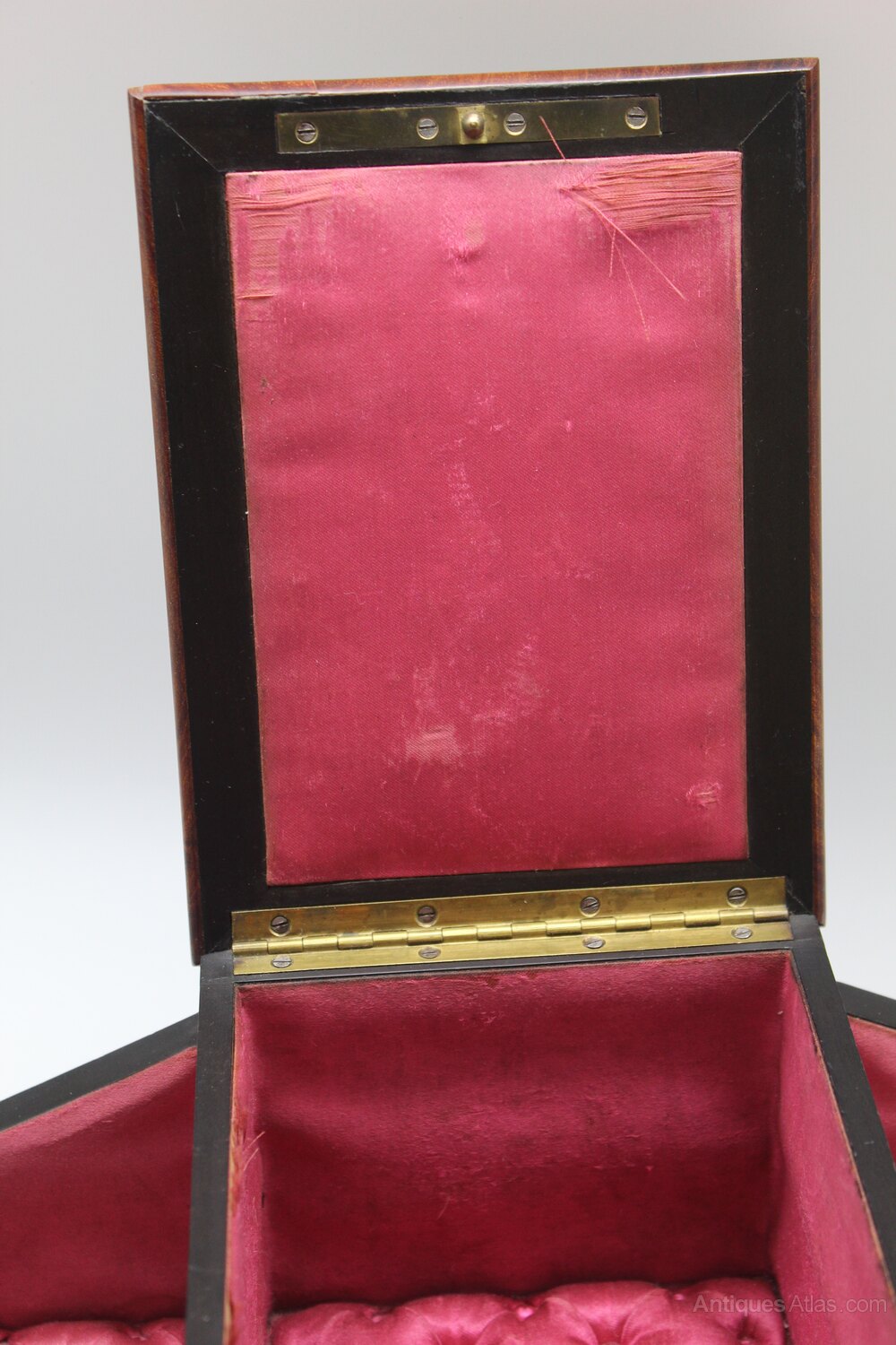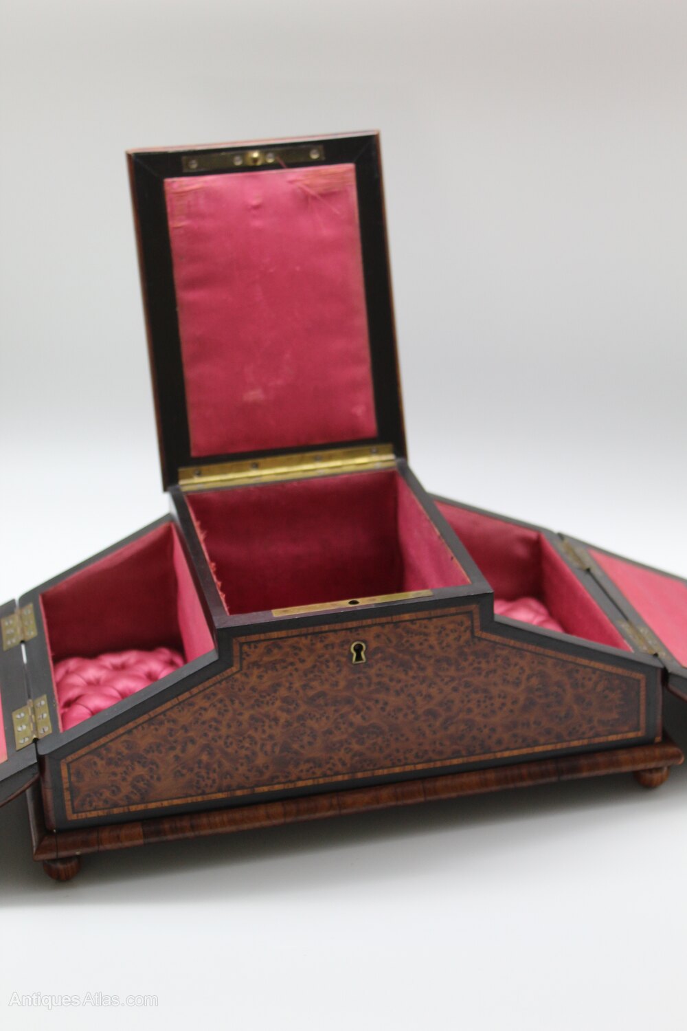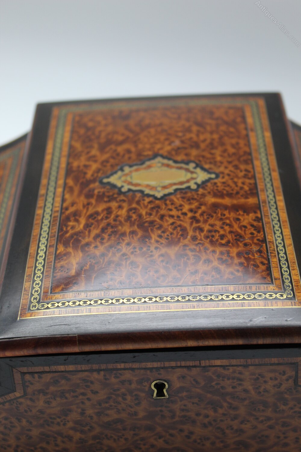 Wonderful quality antique jewellery box. Amboyna burl (burr) from the Narra tree. French C1850, Napoleon III. Possibly by the maker Tahan. Three separate compartments. Working lock with key - locks central section and secures lid of right hand section. Inset with brass detail. Excellent condition in line with age and use. Padded and buttoned lining in original condition - central part has some wear to inside of lid and side - see photos. 29.5cm wide, 18cm deep, 12cm high. More photos available on request.