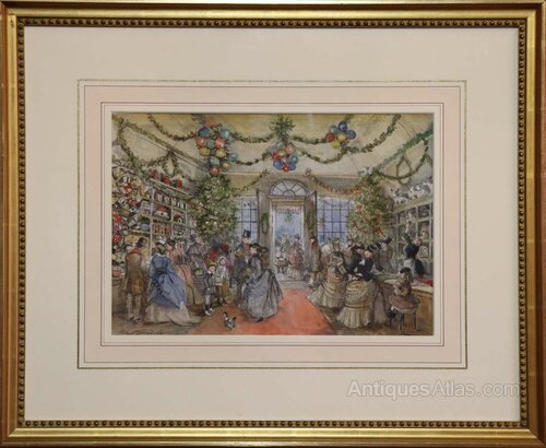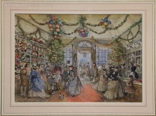 A charming and finely detailed watercolour heightened with gouache by John Strickland Goodall, depicting a festive Edwardian interior scene. Figures bustle among decorated Christmas trees, garlands, and shelves laden with toys and gifts, capturing the nostalgic atmosphere of the season with warmth and humour. Signed lower left. Presented in a gilt frame with double mount.