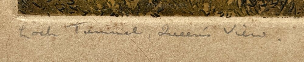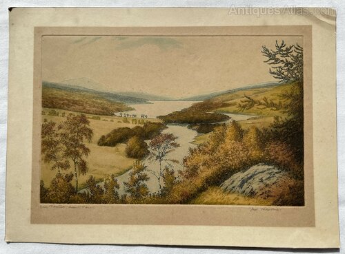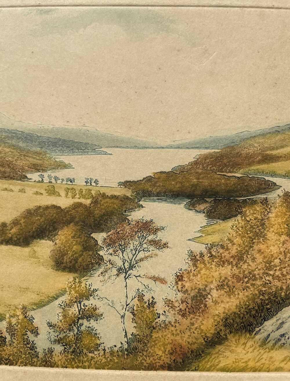 A charming original aquatint etching titled in pencil Loch Tummel the Queen’s view. Produced in the 1st part of the 20th century, this colourful Scottish view is signed by Kirkpatrick in pencil bottom right. The image is 28cm x 18cm and the board is 35.3cm x 25.3cm.