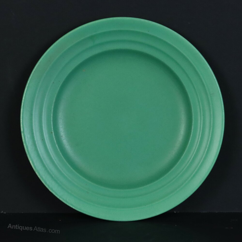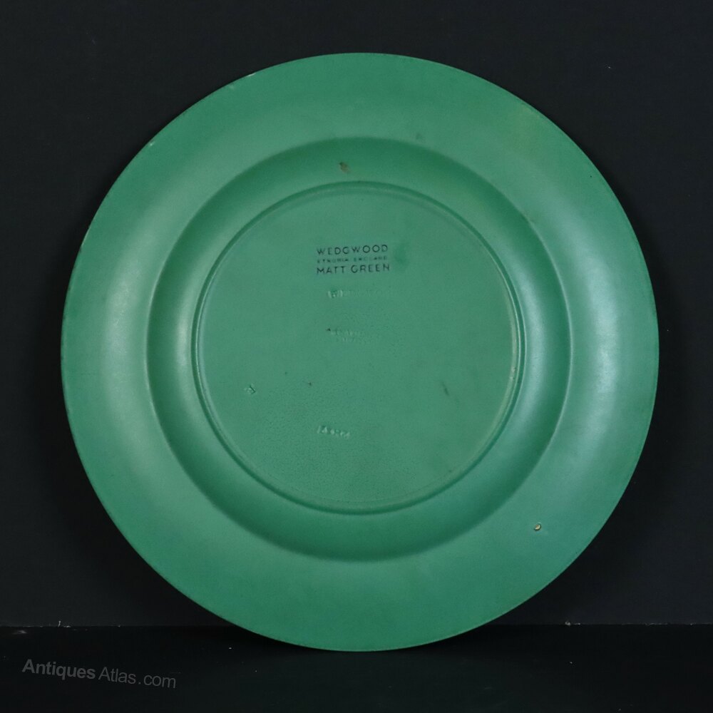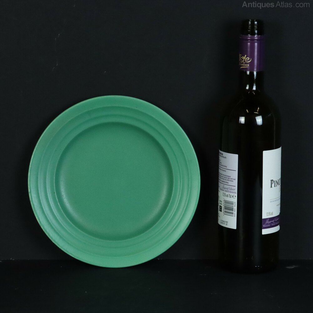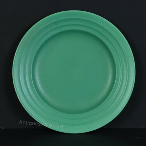 These plates are the result of a successful collaboration between Norman Wilson who, as Wedgwood's production manager, was responsible for developing new glazes, including this innovative matt green glaze and Keith Murray who created the modernist annular shape based on early 20th century industrial design.