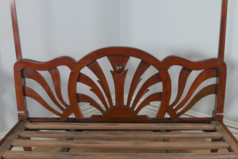 This is a rare antique king size Art Deco colonial Raj mahogany four-poster bed, circa 1920, in excellent original condition.
