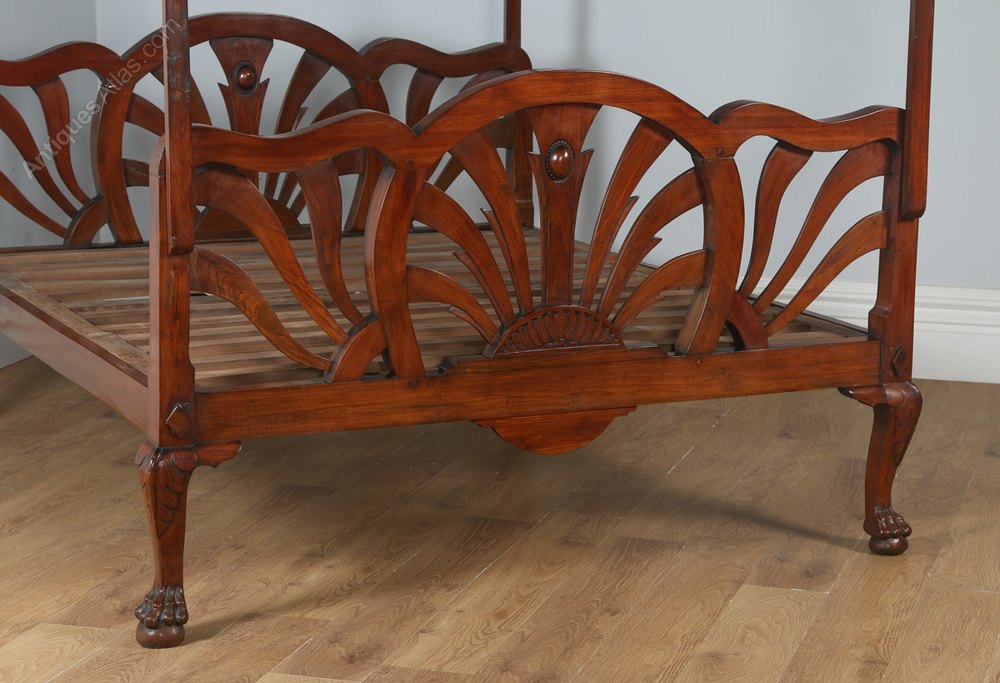 This is a rare antique king size Art Deco colonial Raj mahogany four-poster bed, circa 1920, in excellent original condition, originating from colonial India. This bed will snugly fit a standard UK king size mattress size (5ft wide by 6ft 6” long) with the slats, or a maximum custom mattress size of 5ft 9” wide by 6ft 6” long lowered (please see section “Lowering the Slats” below for further information). The bed boasts classic Art Deco styling with the lovely pierced oval shaped head and footboard, flanked by pierced fan shaped detail, below a shaped top rail. The centre of the head and footboard are decorated with a small oval carved cartouche and a dome shaped carved panel below. The bed frame incorporates rectangular side rails and is raised on cabriole shaped legs, adorned with foliate carvings at the knees, terminating on lion paw pad feet. The bedframe incorporates four tapering posts, which support a drop down canopy. The superstructure lends itself to be dressed with romantic muslin drapes. Please note, the bed can be used without the posts and canopy (i.e. not as a four poster bed). This bed boasts a lovely mellow mahogany colour, which retains the original polish and patination.
