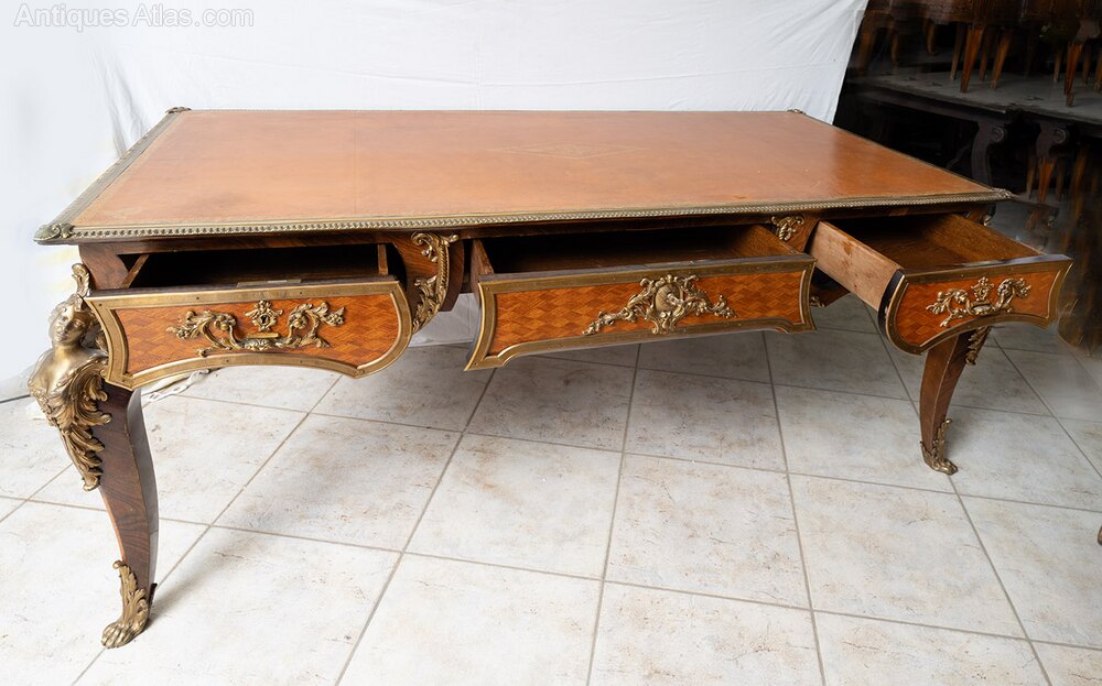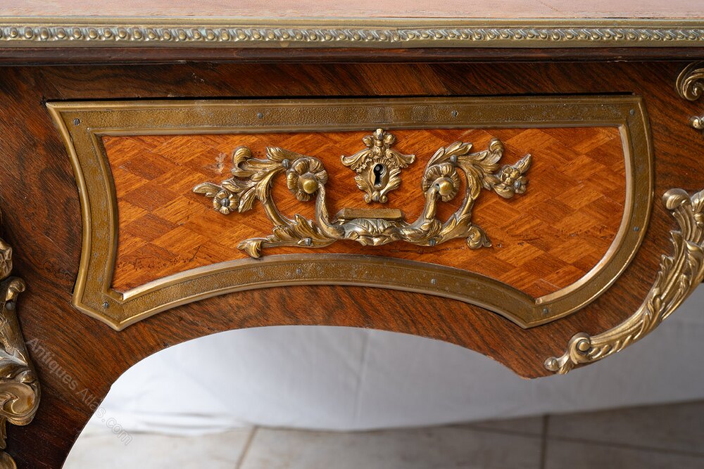 Description: Antique Napoleon III French desk in fine exotic wood with finely chiseled gilt bronze appliqués.