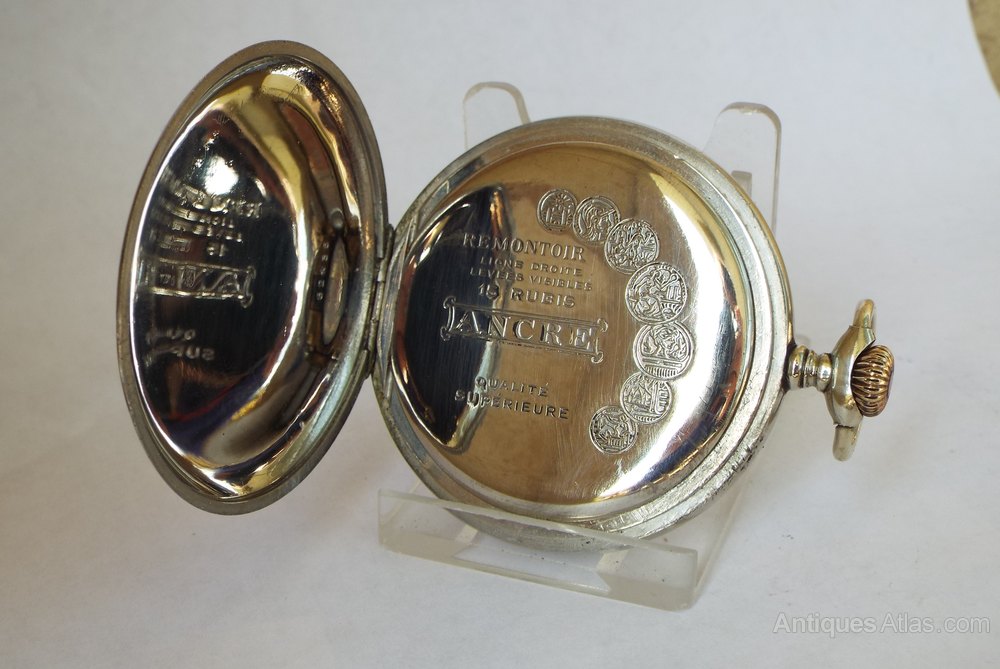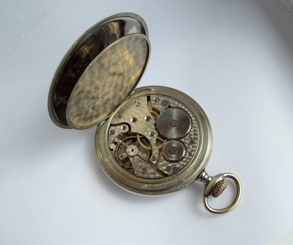 This particular watch has a stem-winding movement which is working nicely. The movement is protected by an inner hinged cover upon which are various details of the movement.
