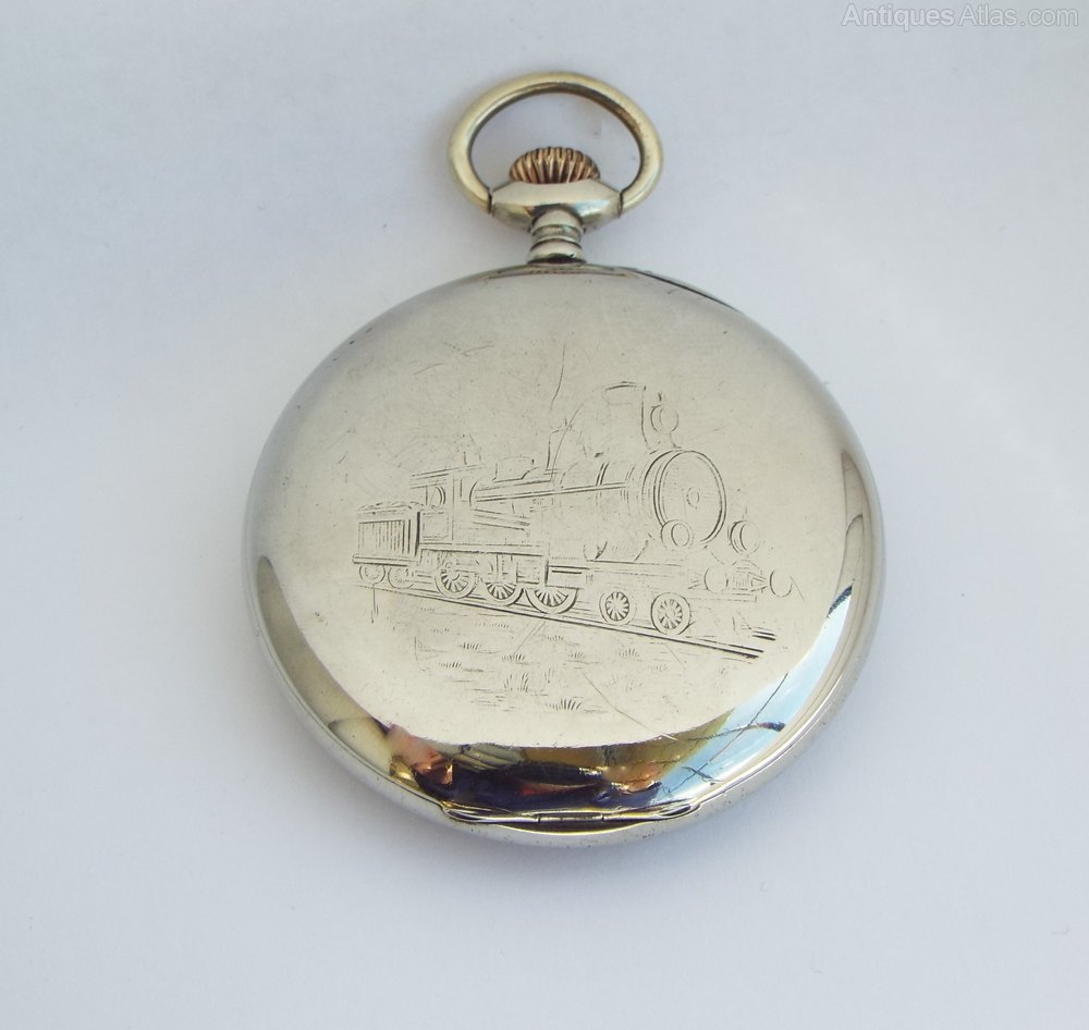 The watch measures 53mm diameter excluding the winding stem and the loop. The case is nickel and the hinged case back has an image of a locomotive. The case is in good condition with just the odd minor surface scratch.