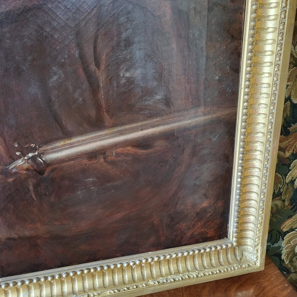 The painting retains its original frame, which carries a label on the back. While there have been some restorations to the background and old repairs to the frame, the piece remains both decorative and traditional, embodying the charm of country house living.