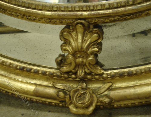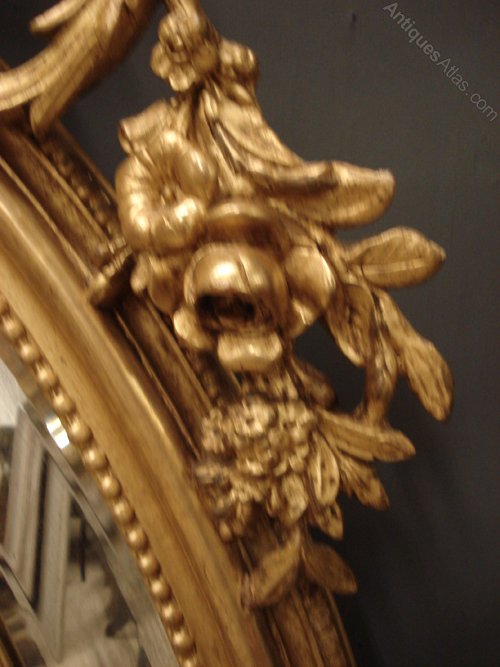 Ref 5345 - Antique French Mirror - Large gilt crested oval margin mirror with gesso decoration to frame. Finished in original two tone gilt on red. Original patinated bevelled glass. Original pine board back. Circa 1890.