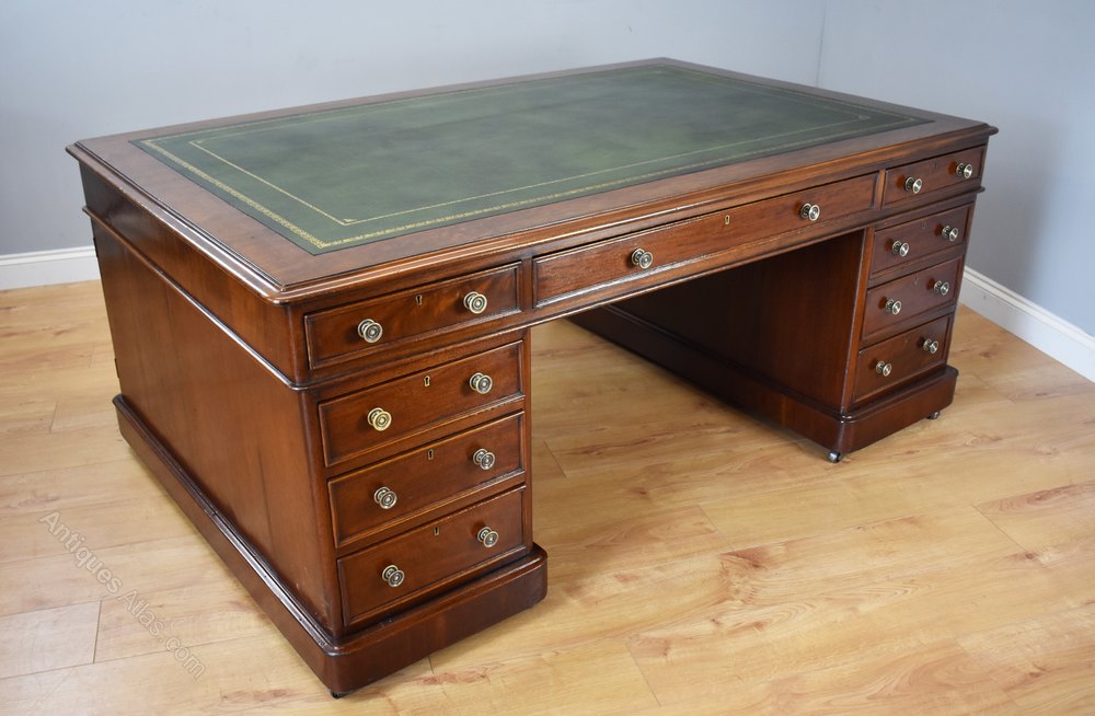 For sale is a fine quality large 19th century Victorian mahogany partners desk. The top having a green leather hide insert, decorated with blind and gold tooling and corner motifs, surrounded by a mahogany band with a mahogany thumb moulded edge. The desk top has three drawers to the front, and another three drawers on the opposing side, this fits onto two pedestals, each with three drawers to one side, and a cupboard on the other. All of the drawers are hand dovetailed and mahogany lined and have their original brass handles. The desk can be set up to have drawers to the front, and cupboards to the back, or alternatively can have one set of drawers and a cupboard to the front, and the same on the reverse. The desk is in very good condition for its age and was made by M.E Edgley of London.