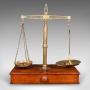 This is a fine set of antique apothecary weighing scales. An English, brass, mahogany and walnut countertop balance for the tobacconist or chemist’s shop, dating to the early Victorian period, circa 1850. Wonderfully presented with associated weights and charming period detail.