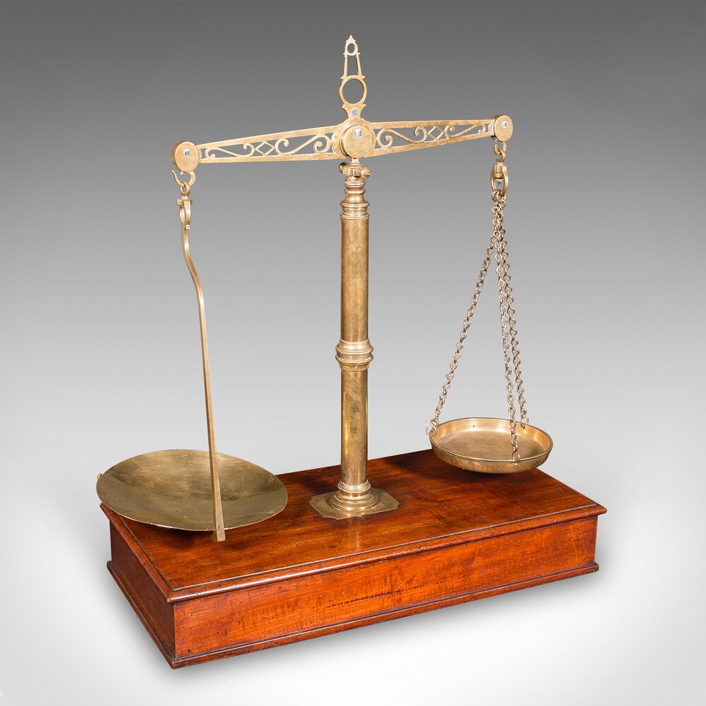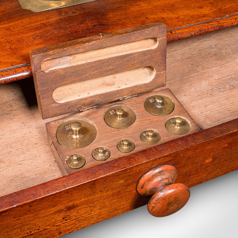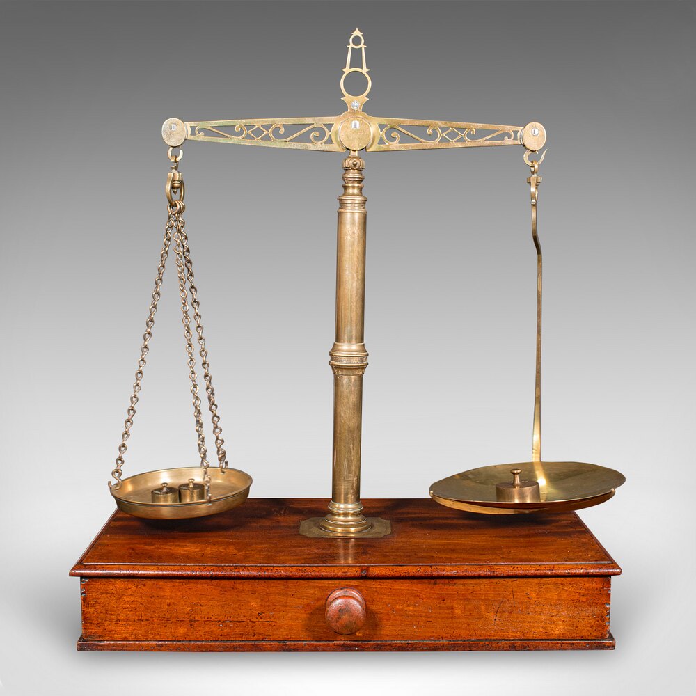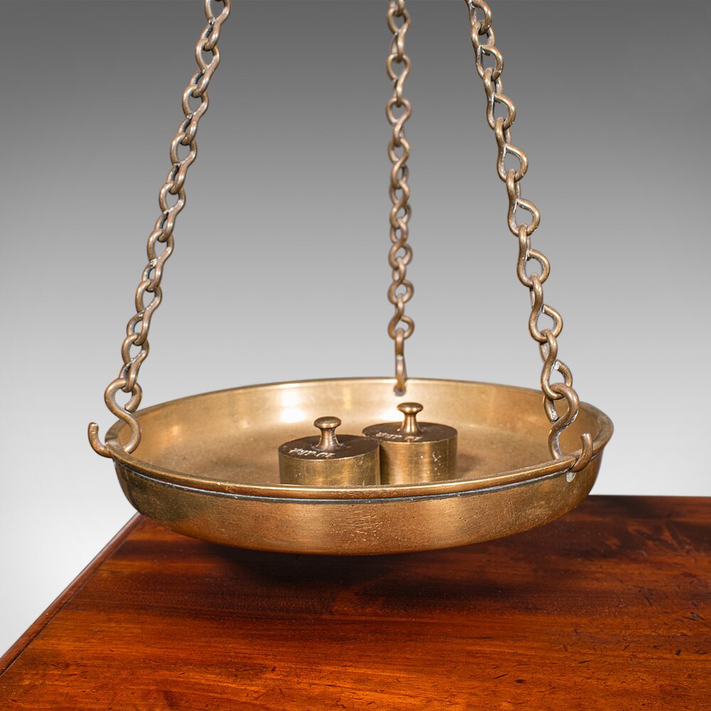 A captivating item for antique interiors, chemistry enthusiasts, or retail nostalgia, this apothecary weighing scale embodies elegant 19th century precision and craftsmanship. Solid joints and construction, delivered ready for the home.