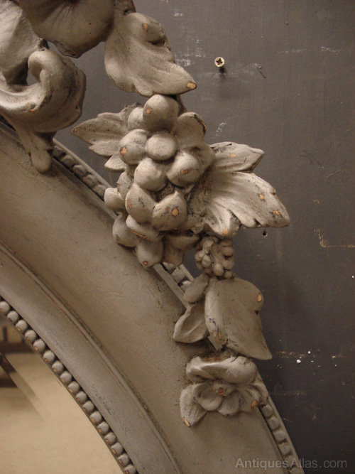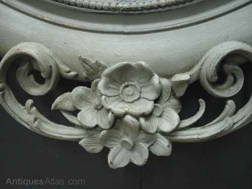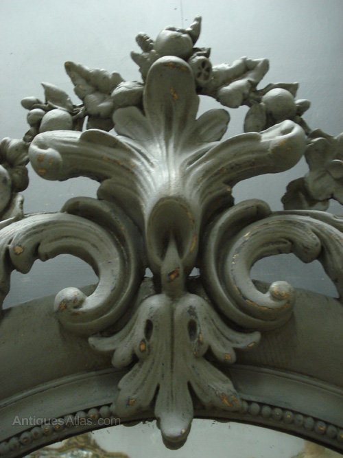 Ref 3931 - Antique French Mirror - Large double crested period Louis Philippe oval mirror finished in worn pale blue/grey over dark grey paint. Original patinated bevelled mercury glass. Original pine board back. Circa 1840.