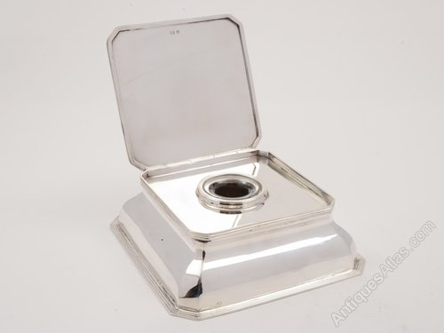 A grand English Art Deco silver and glass ink stand of square form with lift-up lid and glass reservoir which has a star-cut base to bottom. Made by the renowned maker, Hukin & Heath, hallmarked Birmingham 1930.