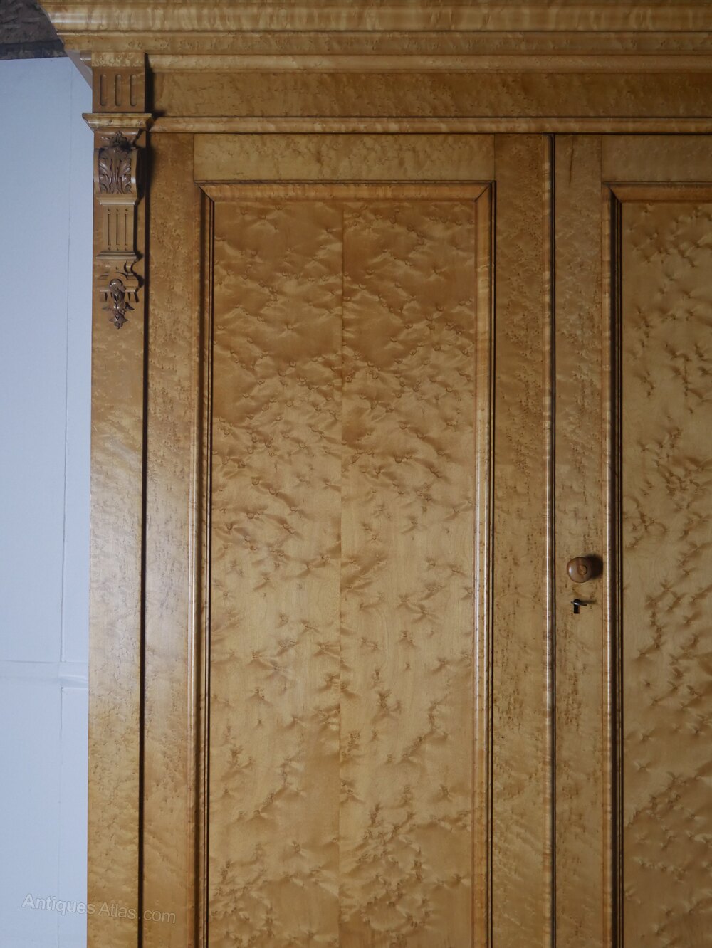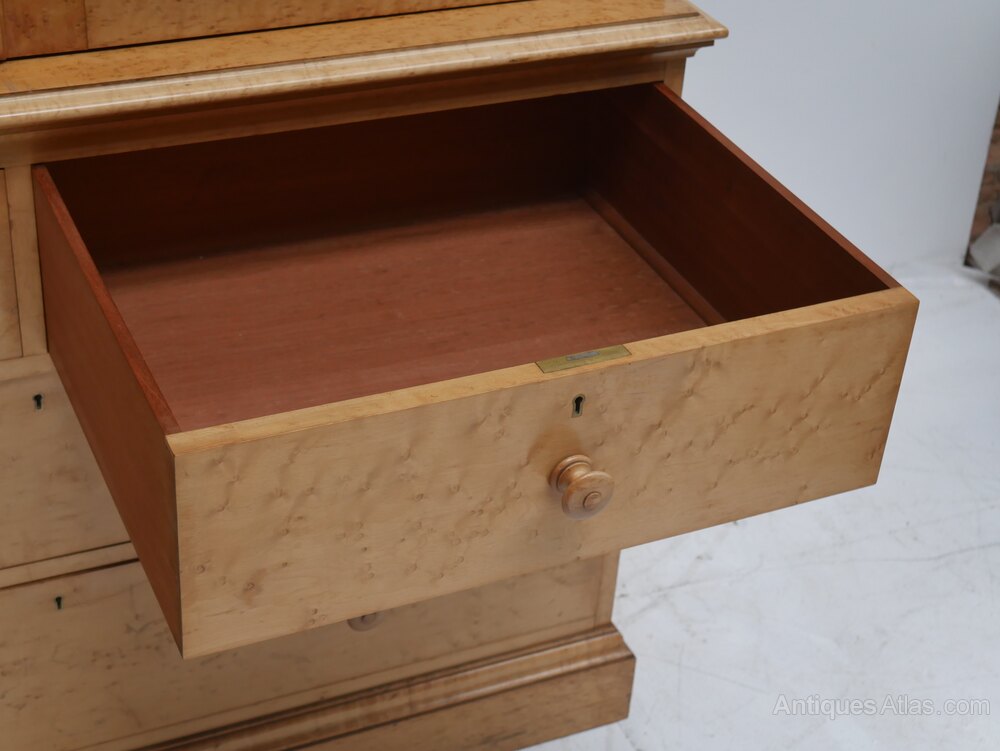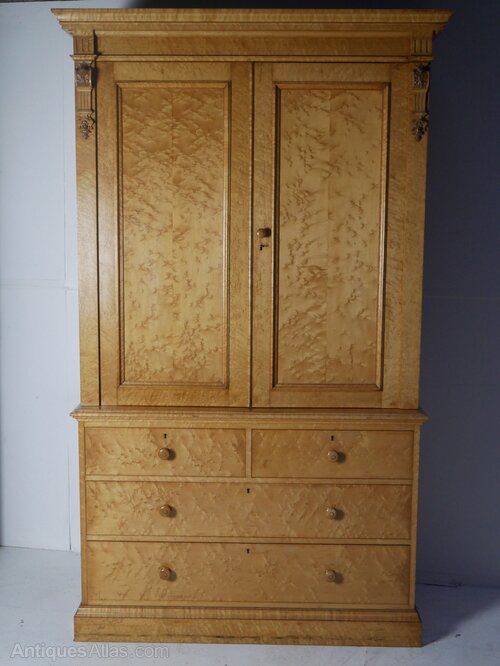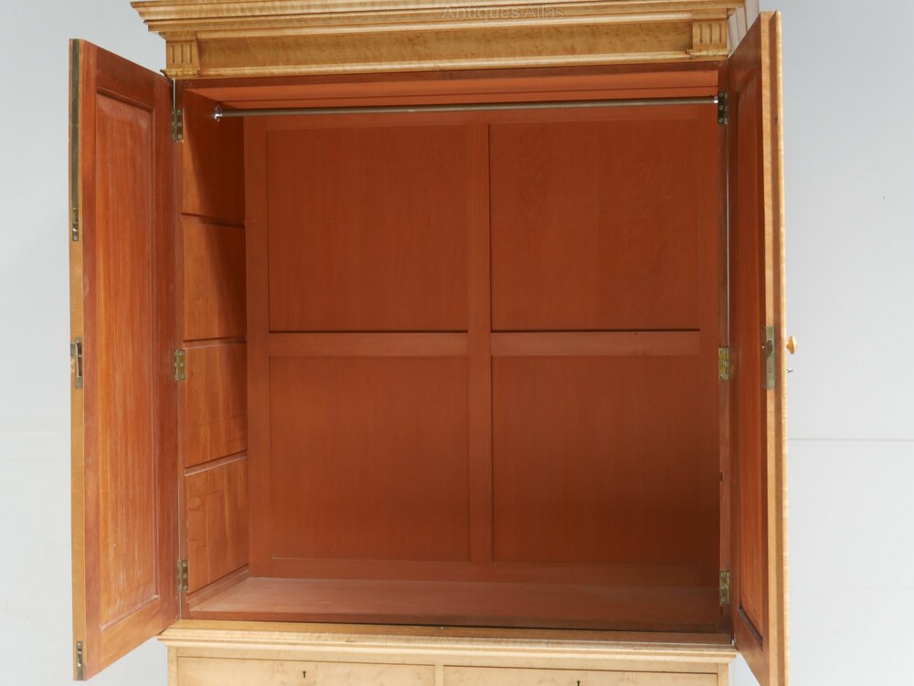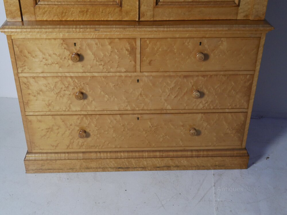 A extra good quality 19th century hanging cupboard in birds eye maple timber, all very well lined in light mahogany. The upper section has a full length hanging rail, the base has excellent deep storage, two long drawers with two short drawers above. A very well made piece attributed to Holland & Sons, all in excellent condition, all ready for use, made around 1860 with key for the top lock.