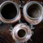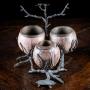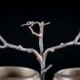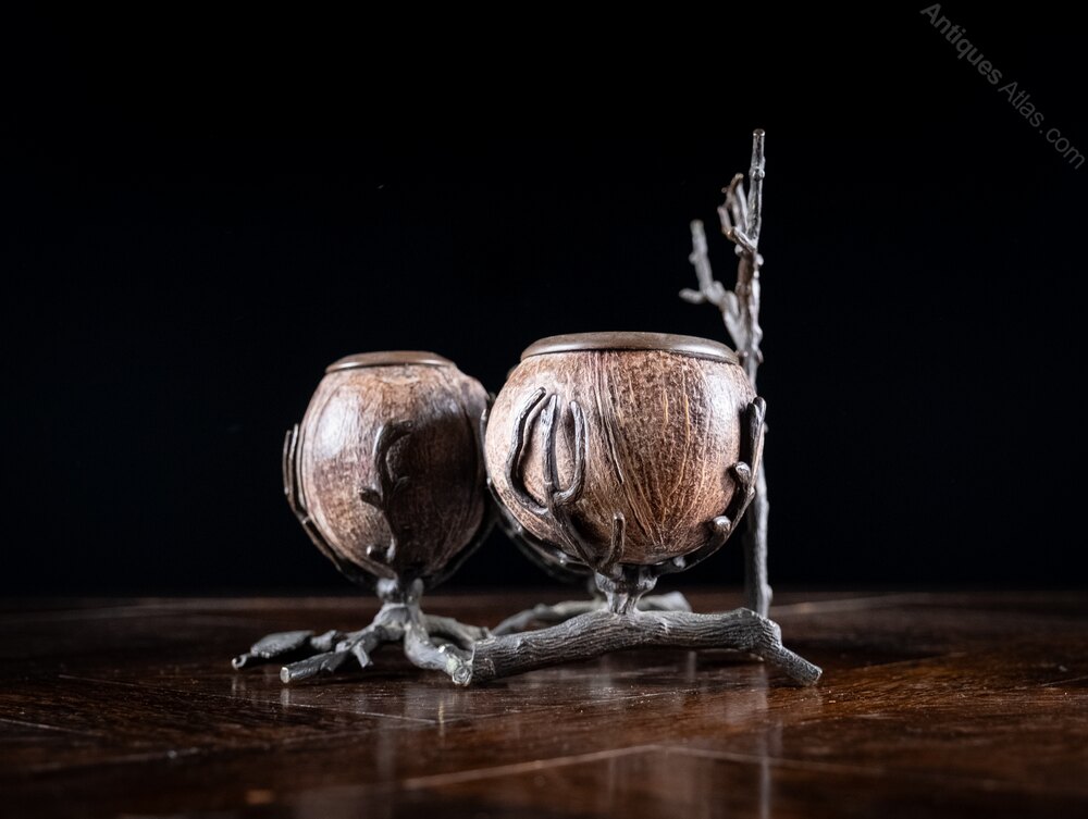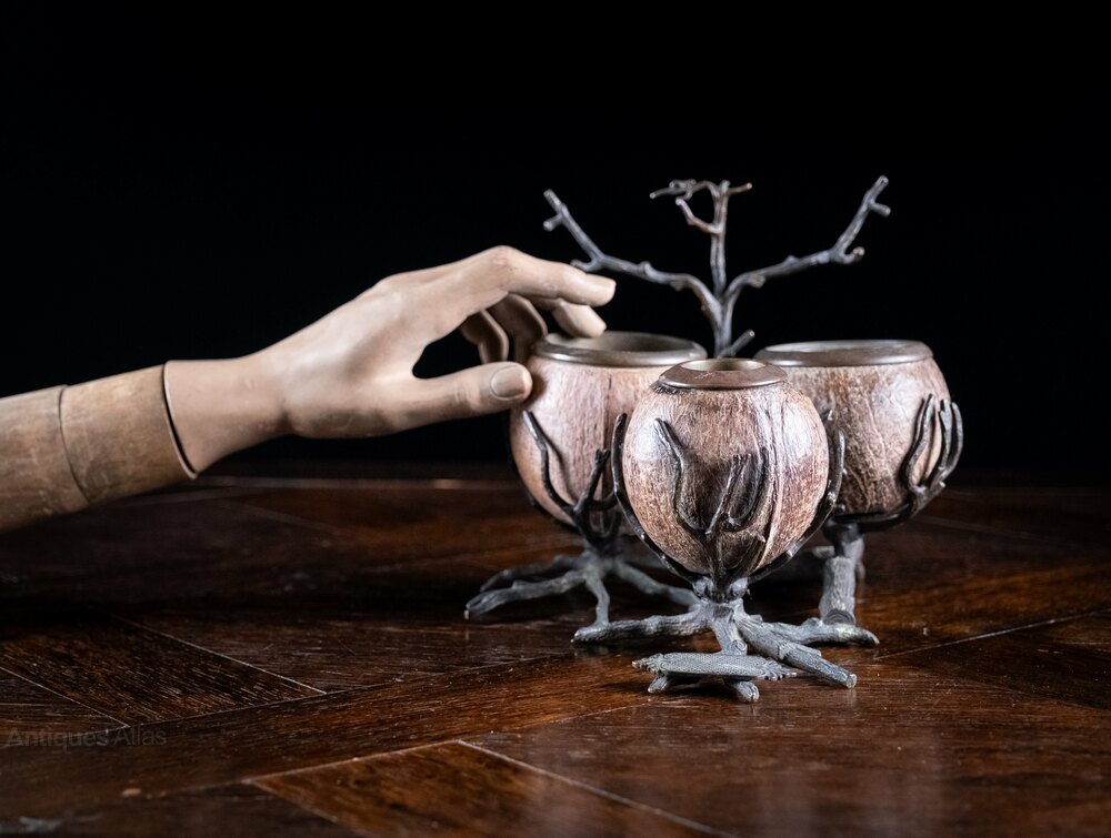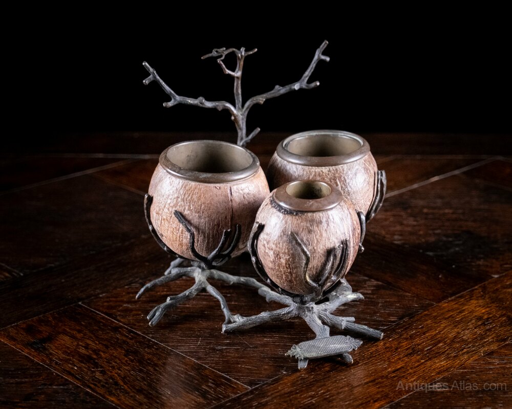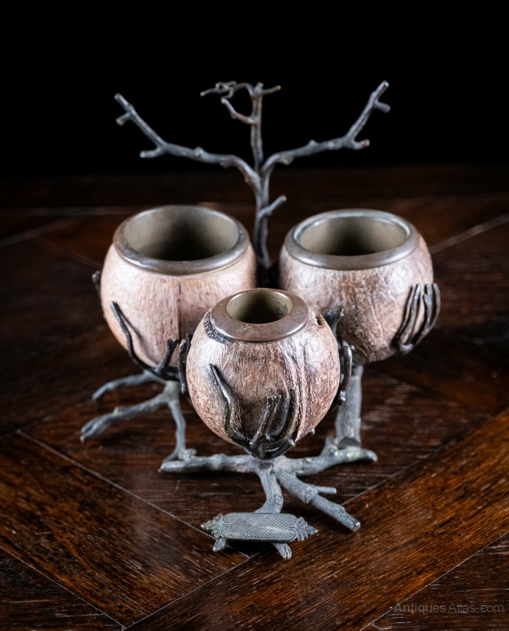 The tree form bronze branch top fans out above three hollowed out and lined coconuts nestled amongst bronze branches, all of which descend into thicker root-like structures with a bronze match striker to the fore.