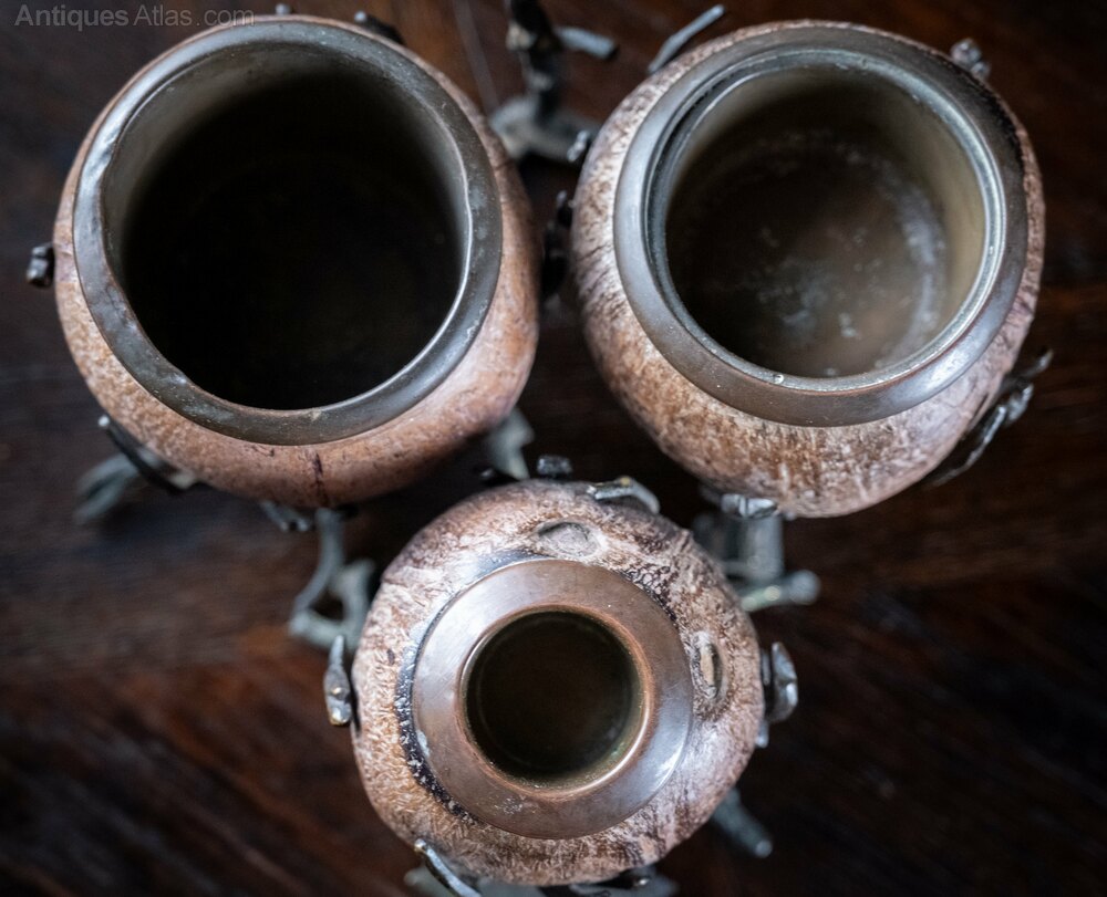 A highly unusual late 19th century bronze and coconut table vesta of large proportions, c.1880. Originally likely a country house smoking companion but now fully functional as a table vesta for toothpicks, candle matches, small cutlery etc.