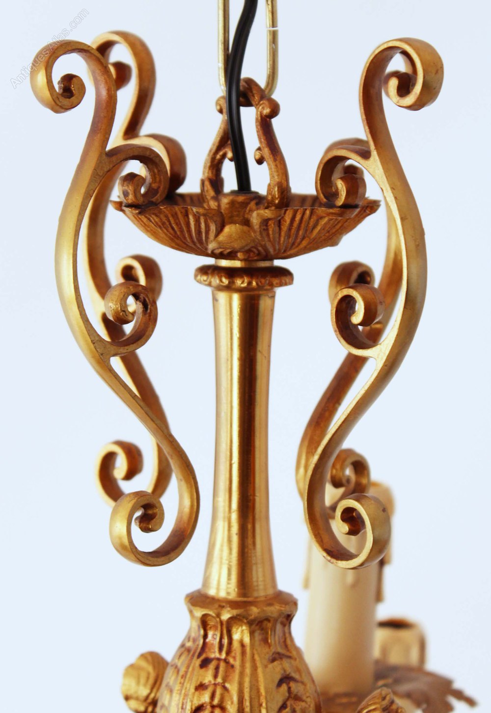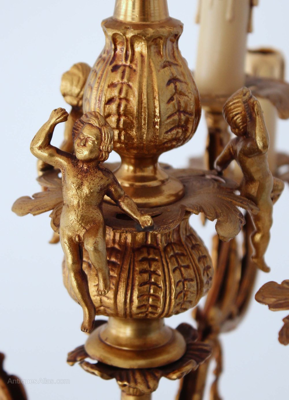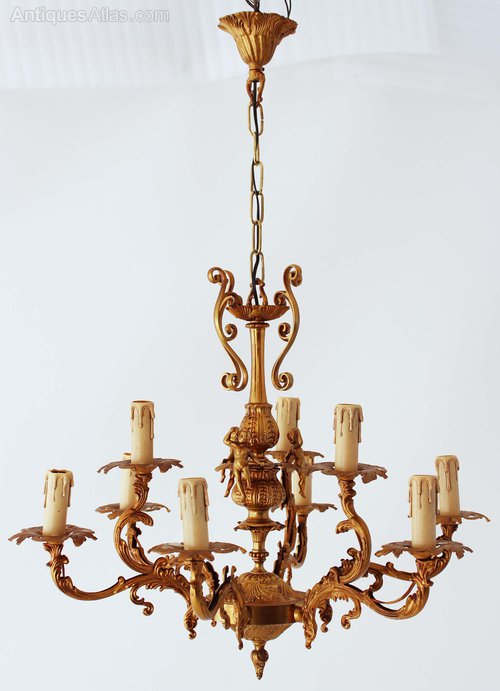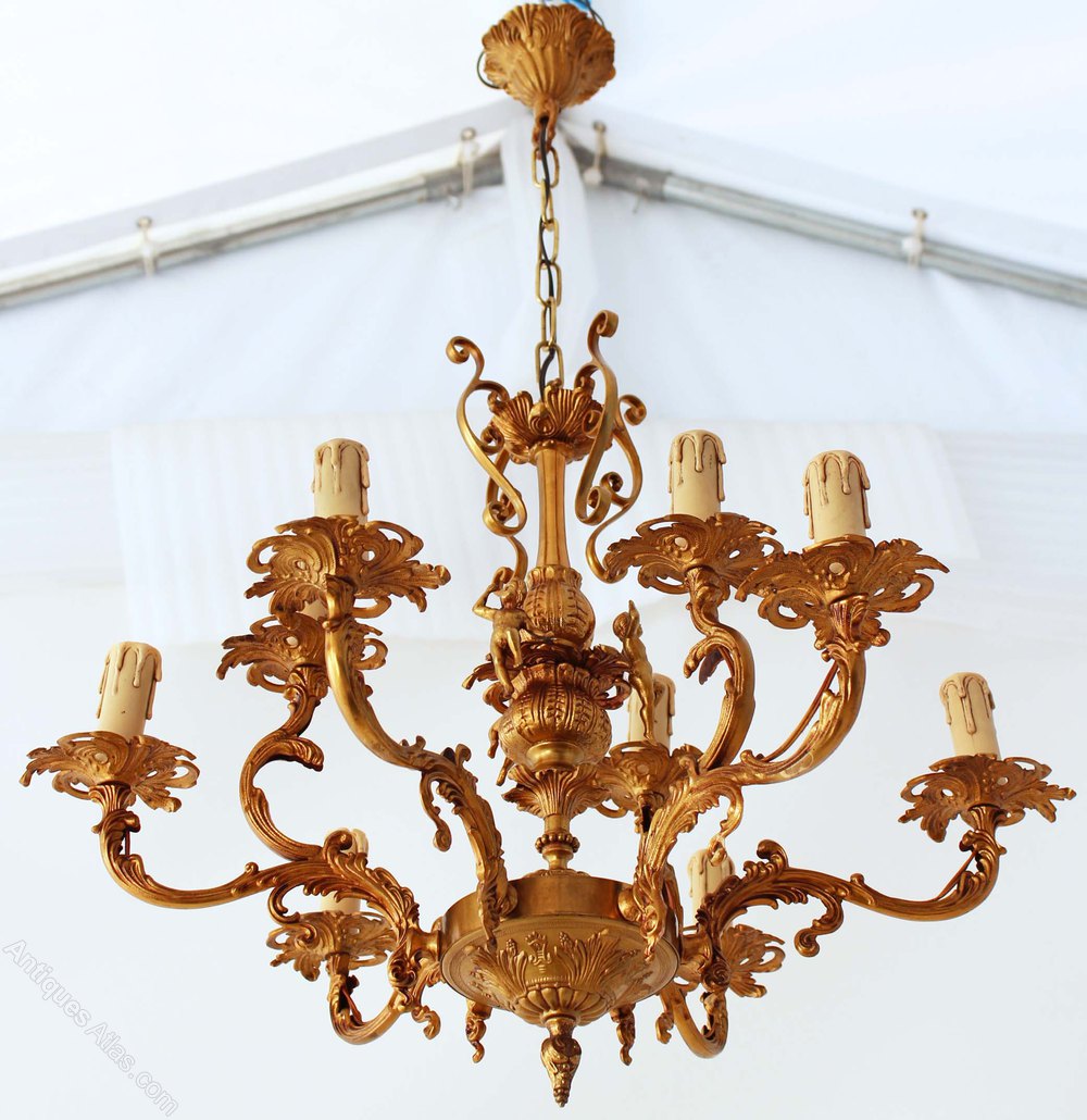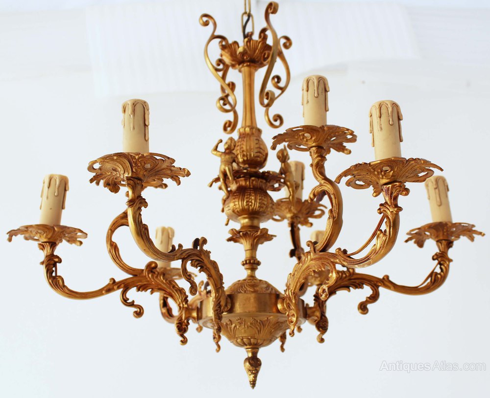 Antique French large cast brass bronze ormolu 6 arm 9 lamp chandelier with cherubs.