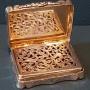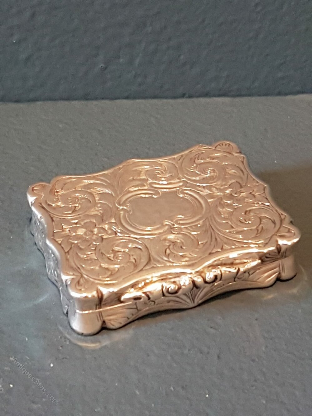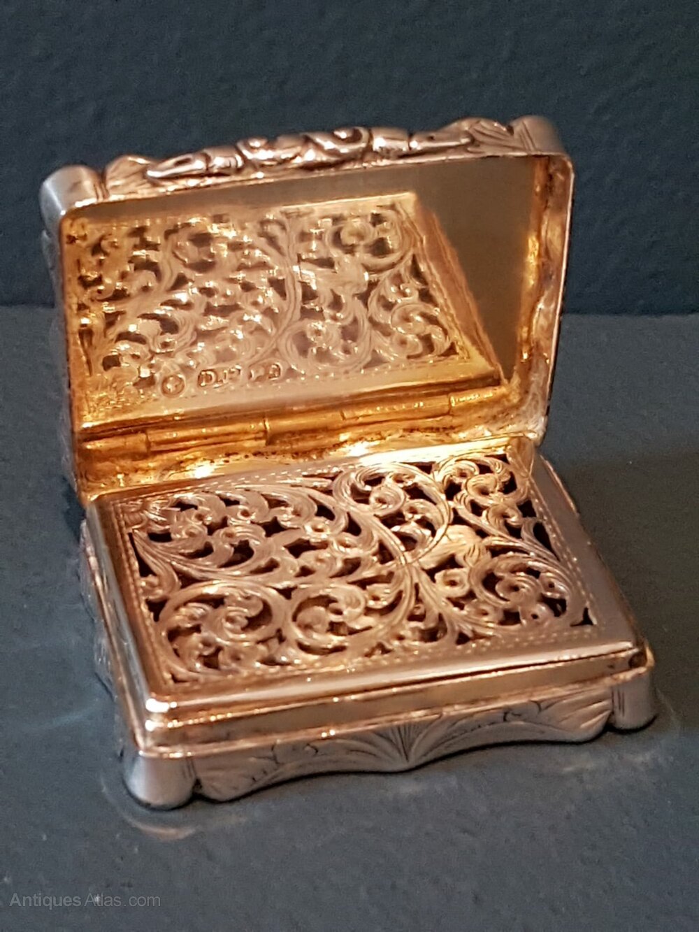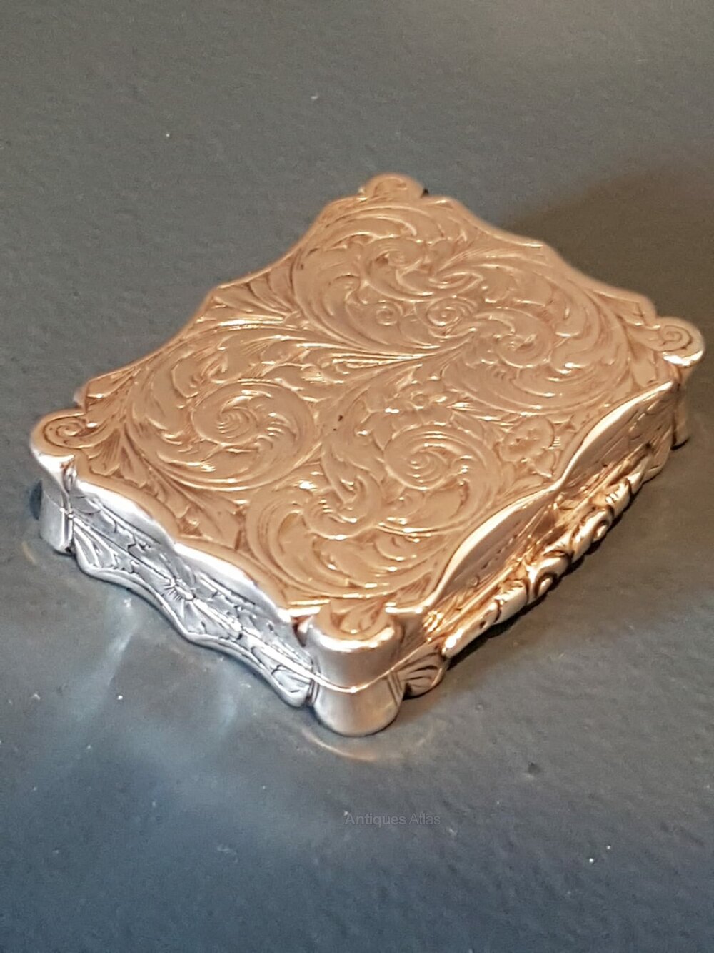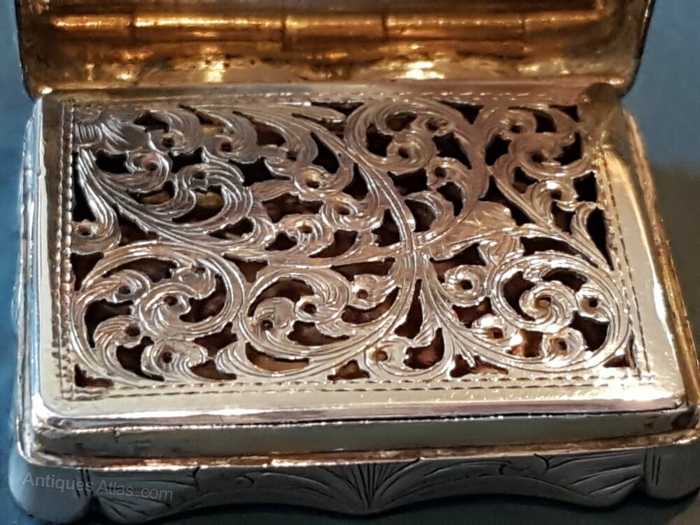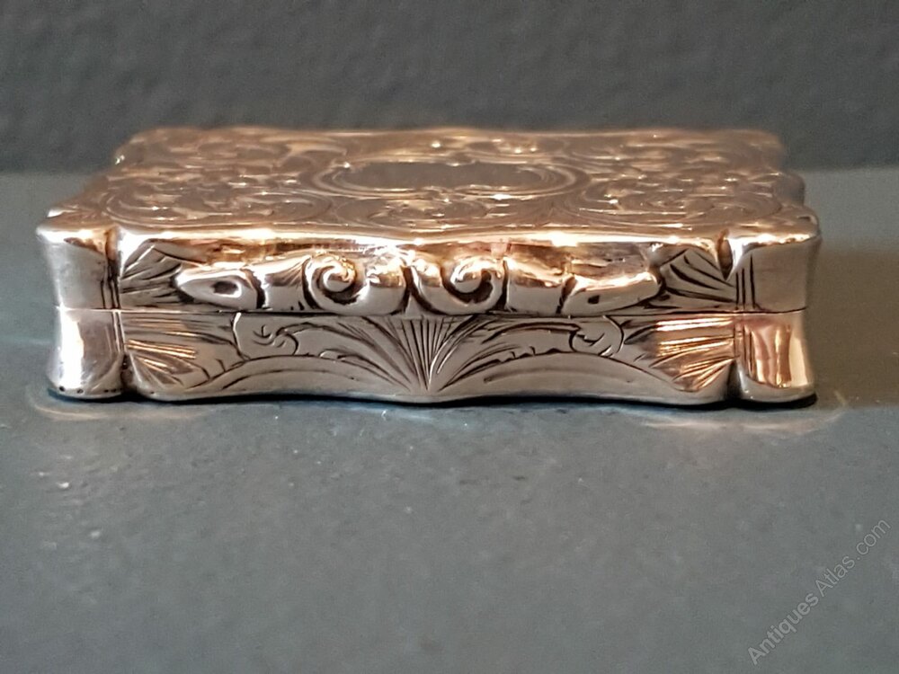A superb large early Victorian solid silver vinaigrette with engraved decoration, hallmarked Birmingham 1855. Oblong form with wavy edges, both sides engraved to a high standard with scroll work decoration. The sides recessed to aid opening. The hinged top opening to reveal a gilt lined interior with fine quality fretted and engraved cover to hold the scented sponge behind. Bears the makers mark for Birmingham silversmith David Pettifer. Presented in immaculate unused condition with a deep shine. Measures 1.75" wide x 1.5" deep x 0.35" high.
