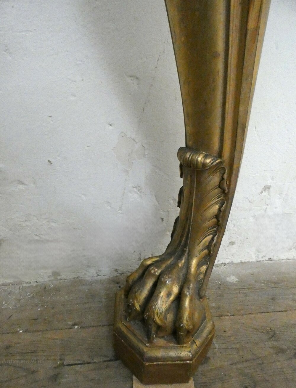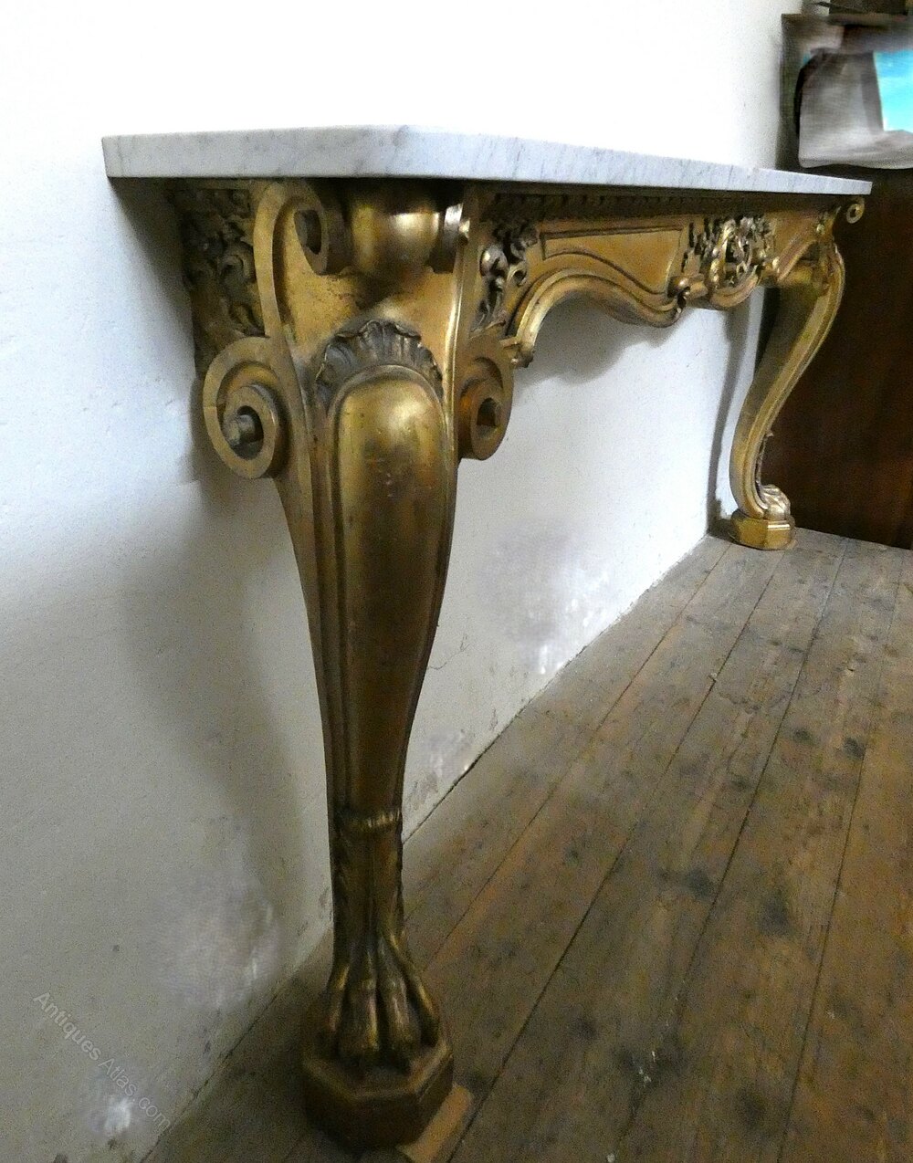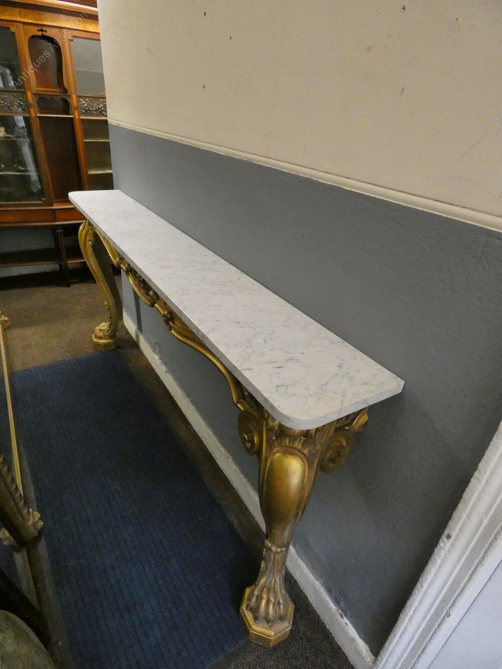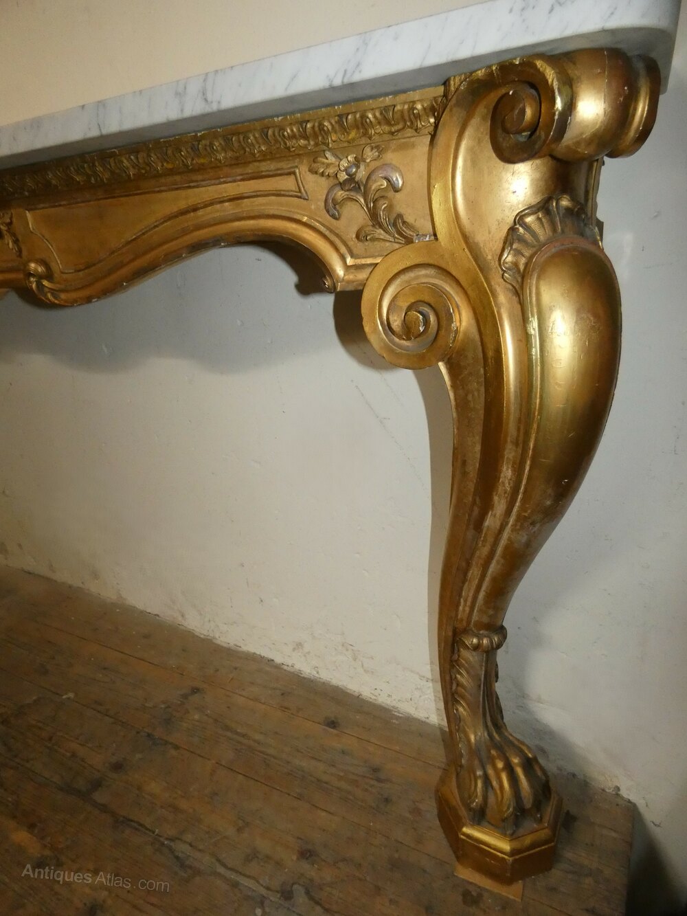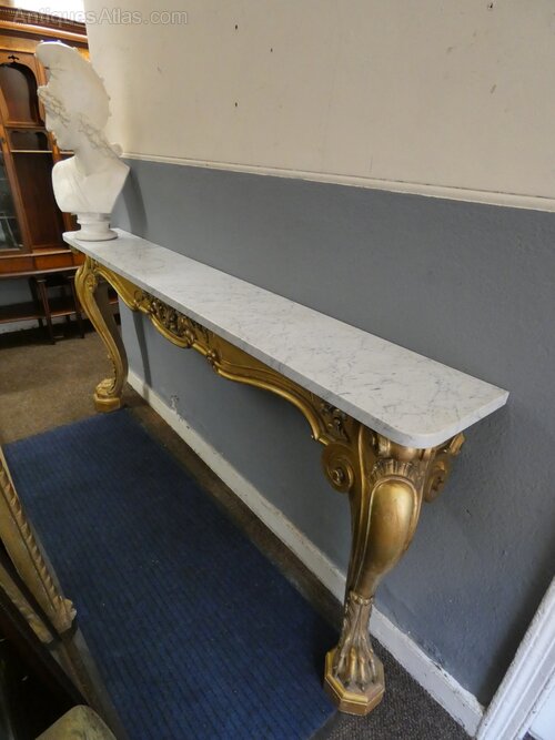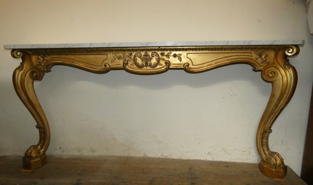 Large and impressive early Victorian gilt wood wall mounted console table with grey veined marble top, decorative carved frieze and raised on substantial carved cabriole legs terminating in fabulous claw feet.