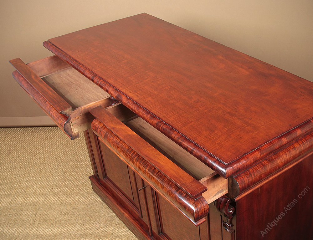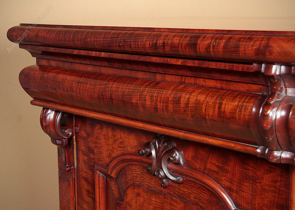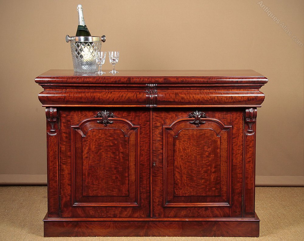 Good sized mid 19th.c. mahogany chiffonier side cabinet c.1860. Two drawers over a two door cupboard fitted with a single shelf inside (internal depth 17″). Sparkling mahogany veneers across the top, front and sides. Deep architectural mouldings around the top and drawer fronts. Arched raised and fielded door panels with raised mouldings and topped with acanthus carvings. Flanked with moulded pilasters below carved and pierced corbels. Raised on a moulded plinth also veneered to match. Solid mahogany drawer linings and groundwork to the doors. Excellent colour and condition, cleaned and waxed in our workshops. Key supplied.