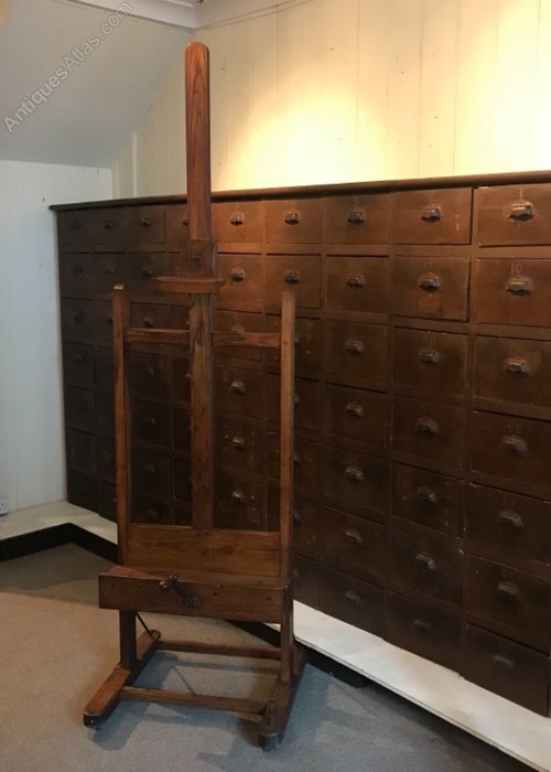 A large oak adjustable artists single sided easle, original castors and winding handle in good study condition.
