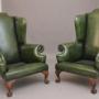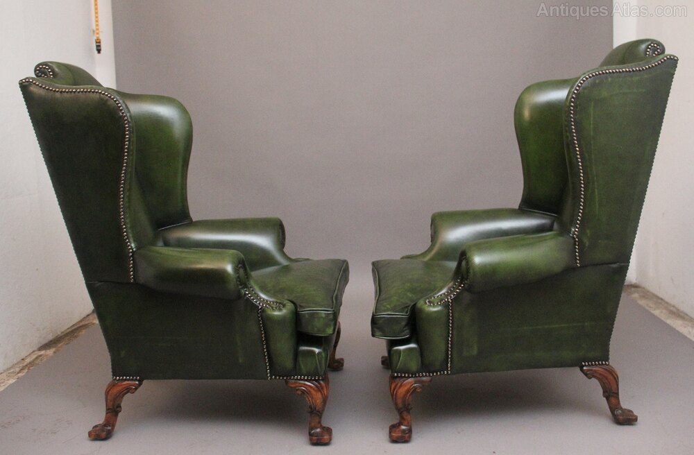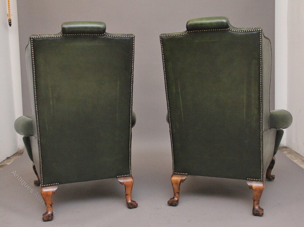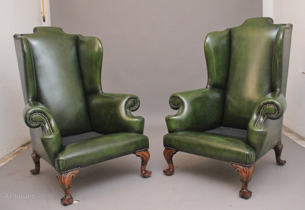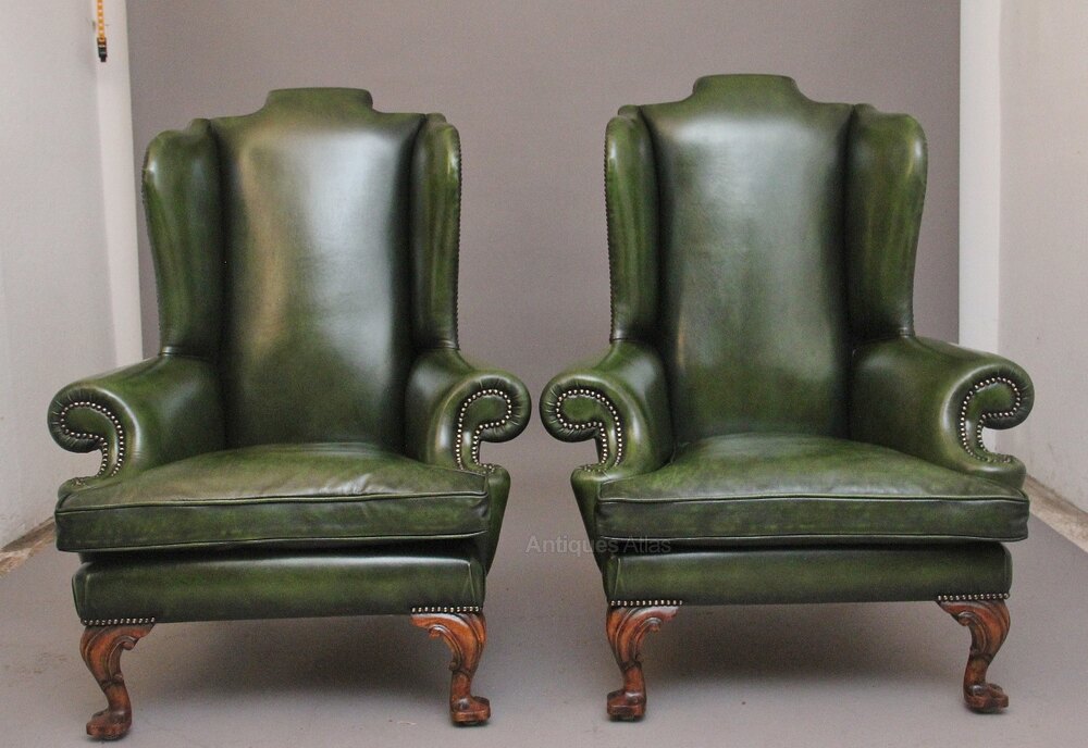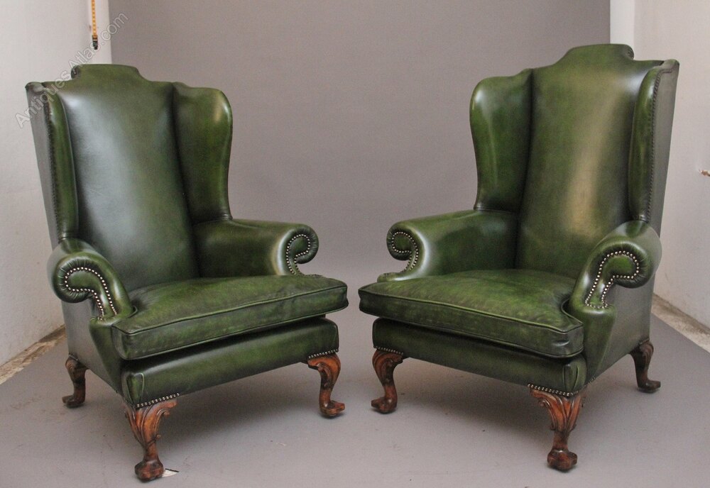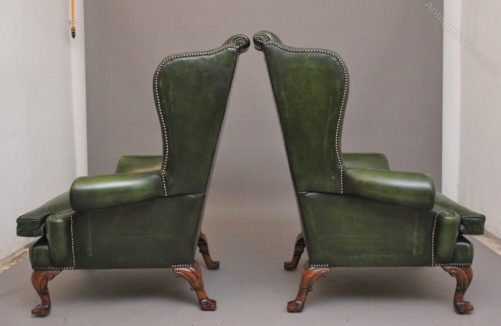 A fabulous pair of large early 19th Century walnut wingback armchairs in the Georgian style, just been reupholstered in a green leather with brass stud decoration, having a shaped high back with winged sides coming down to the curved arm supports, having a very comfortable padded removable cushioned seat. Supported on carved cabriole feet with scroll decoration. Both chairs are in fantastic condition. Circa 1920.