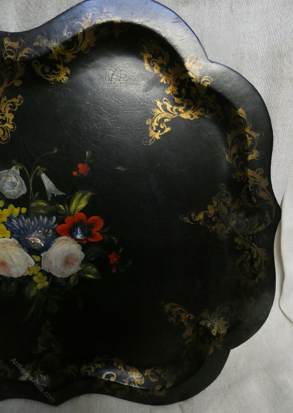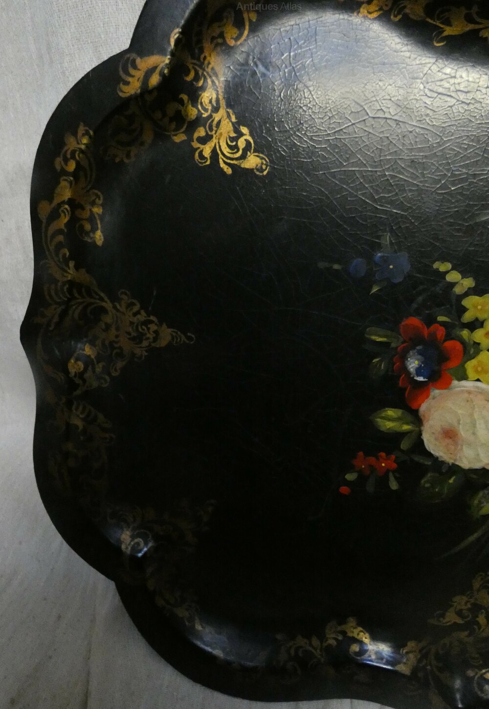 Charming large papier mache tray, with dished centre and beautifully decorative with painted floral and gilt patterns.