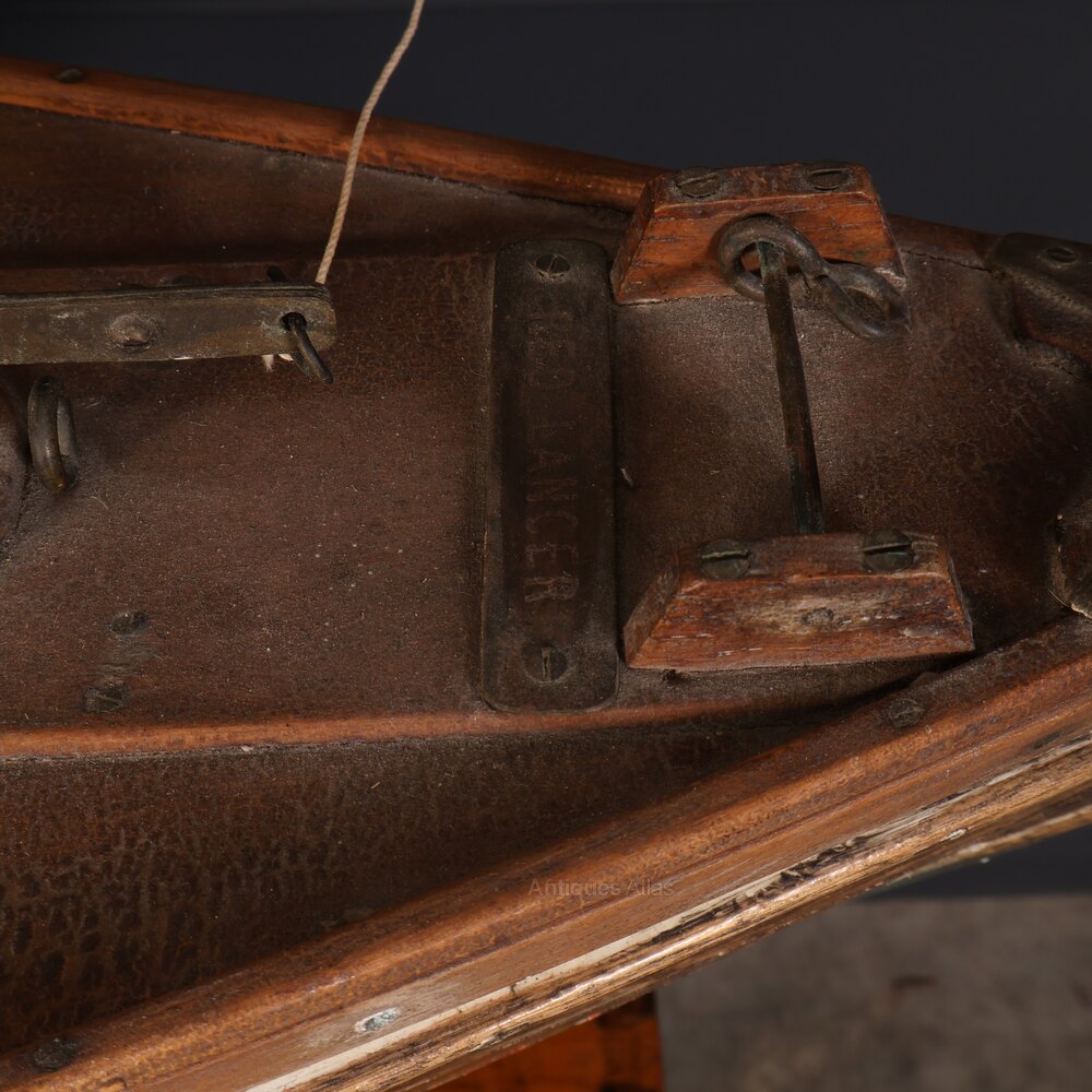 This finely crafted model features a painted wooden hull with traces of its original blue/green finish below the waterline, and a natural weathered deck inset with a metal tag engraved "Red Lancer".