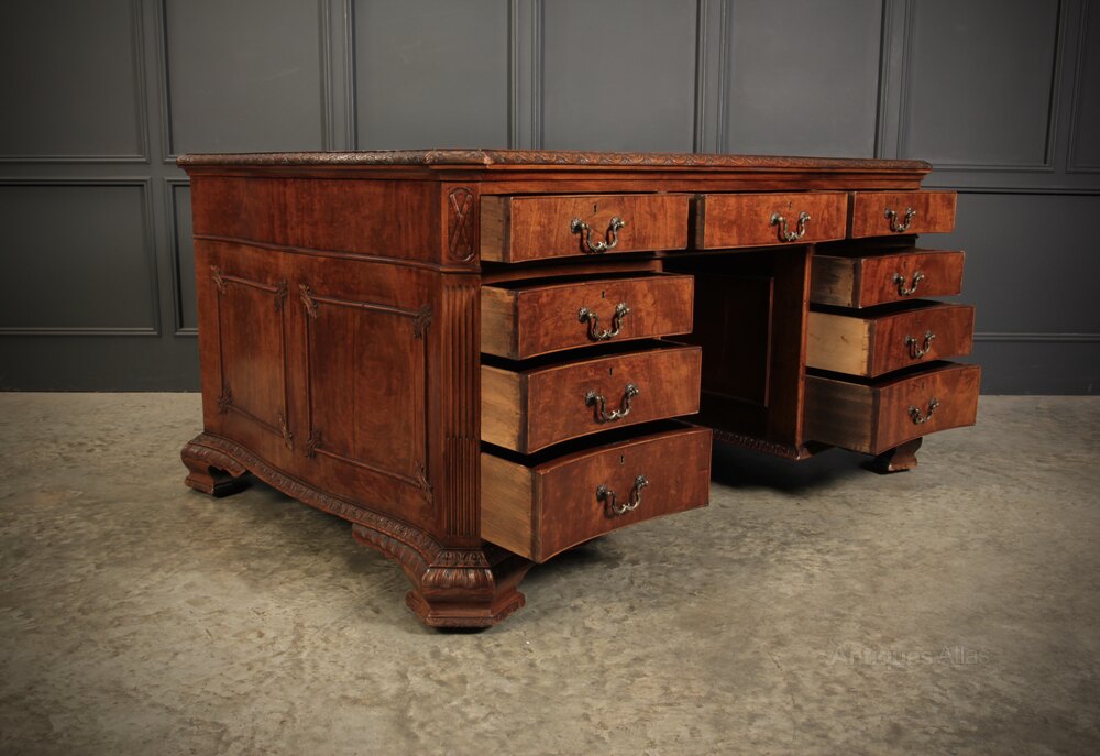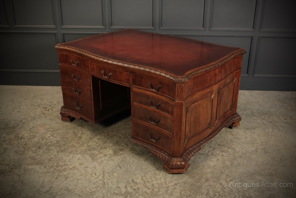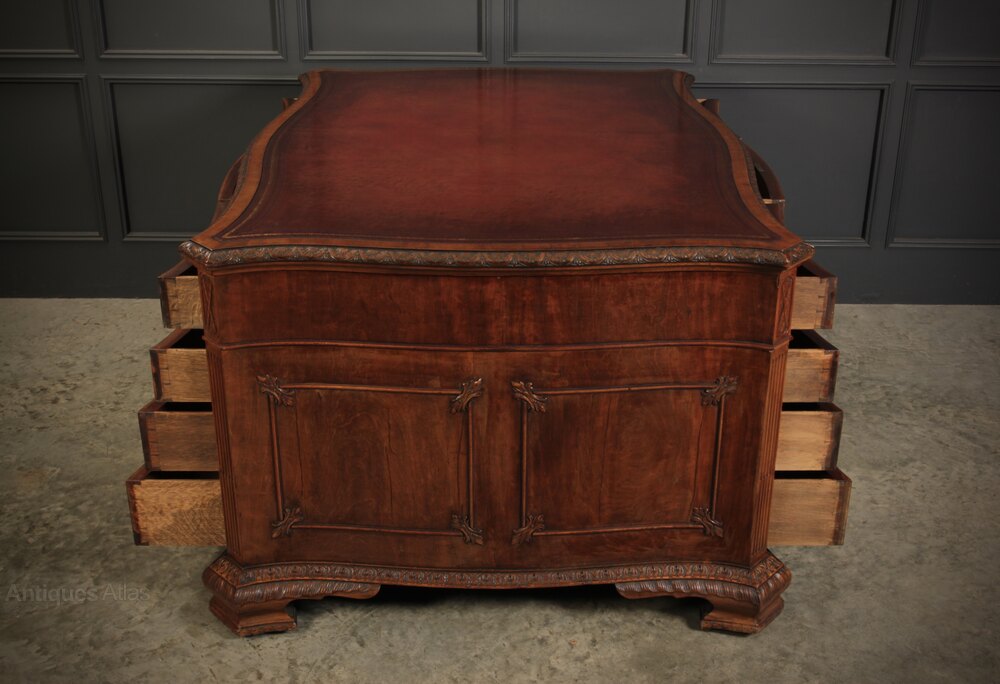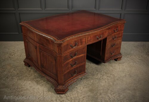 An impressive large mahogany partners desk with serpentine shaped front back and sides, beautifully carved edging and panelled pedestals on both the inside and outside.