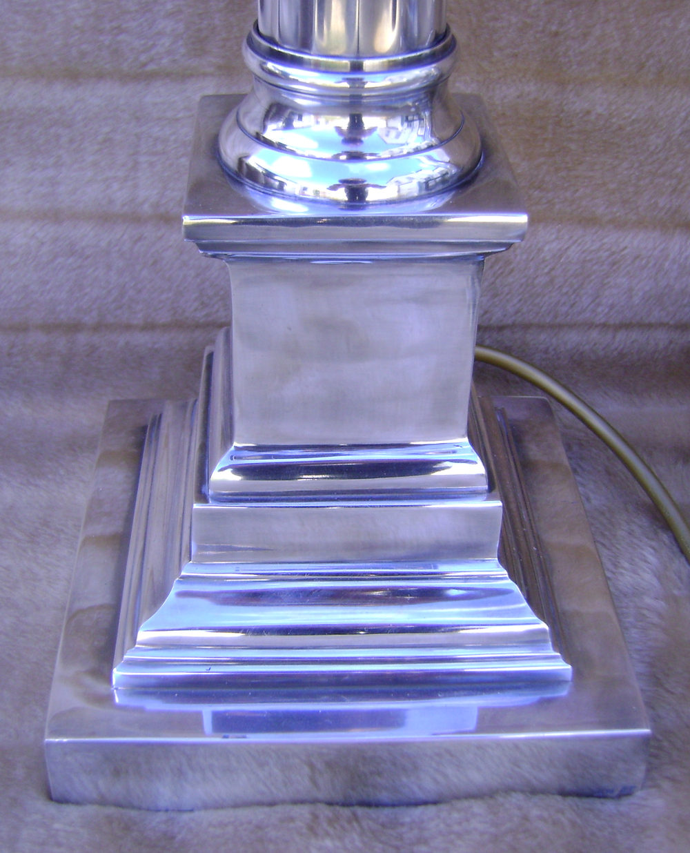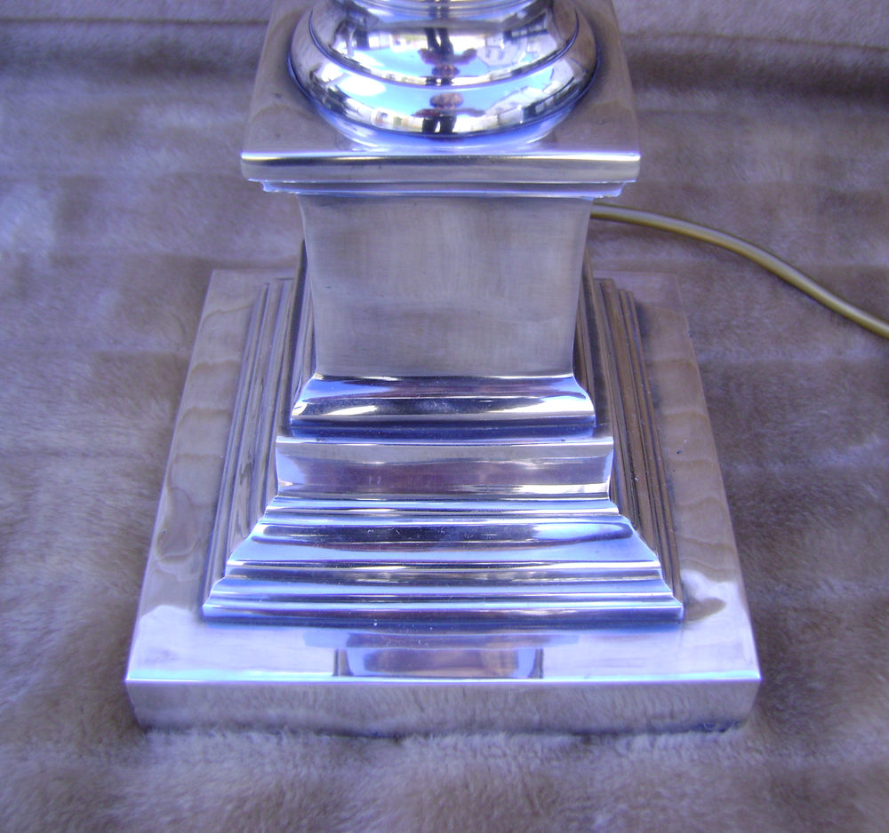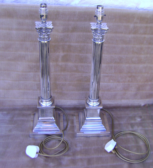 A large and heavy pair of silver plated corinthian column table lamps dating to the early 20th century.