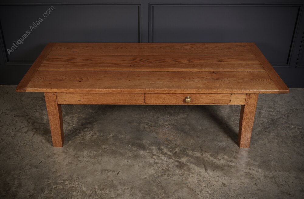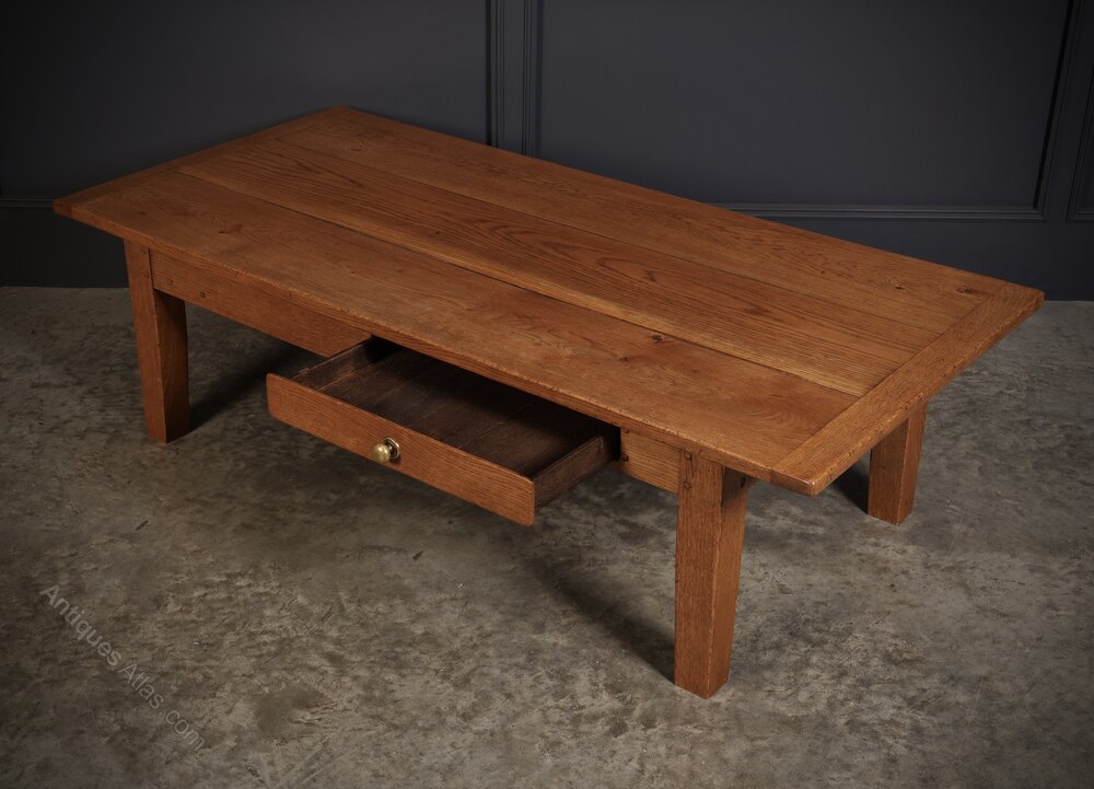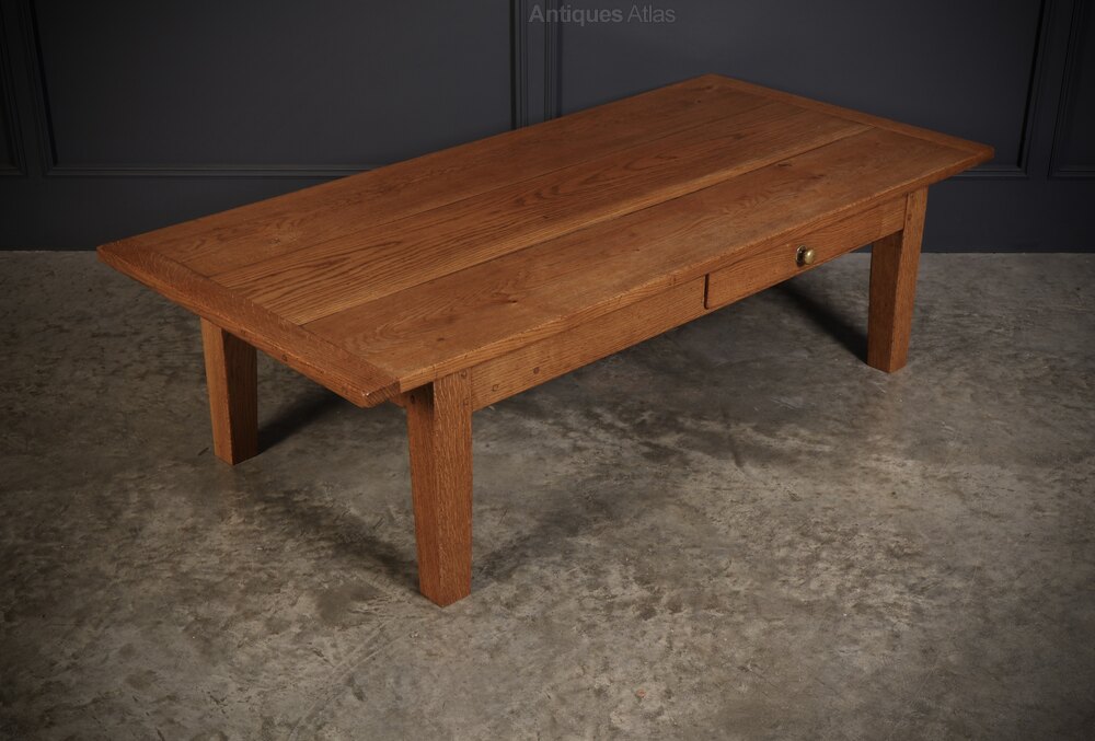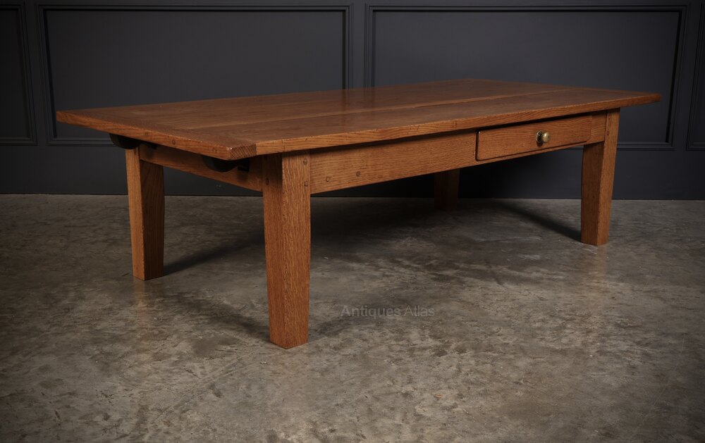 A beautiful large coffee table of solid oak construction, with a plank top and cleated ends and a full depth drawer on one side with brass handle.