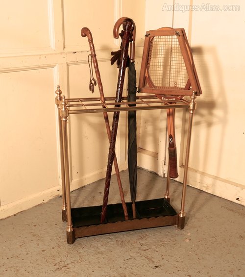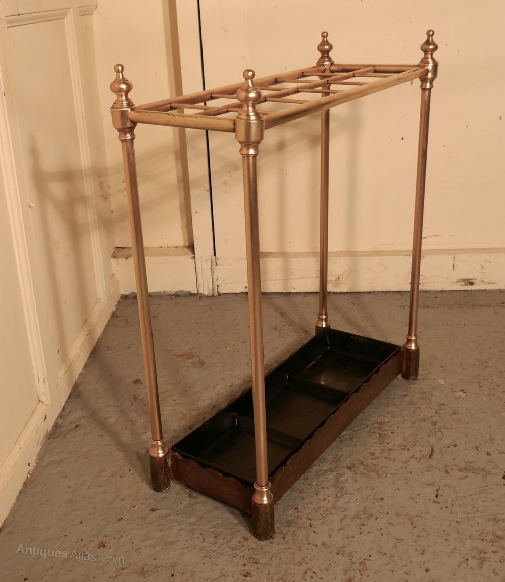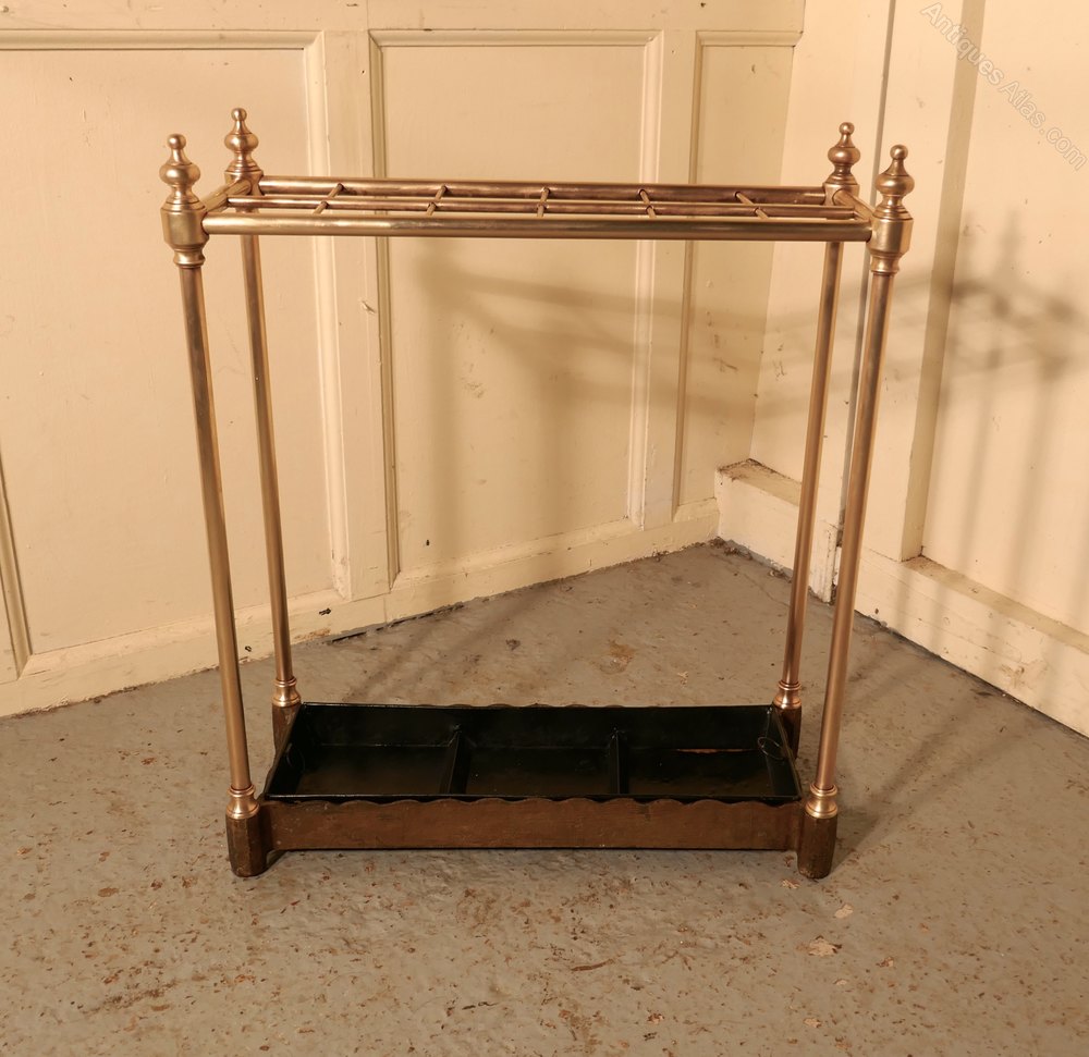 A charming piece and large then most, the stand has a brass top divided into 12 sections to hold either Walking Sticks or Umbrellas, the heavy iron base holds the drip tray