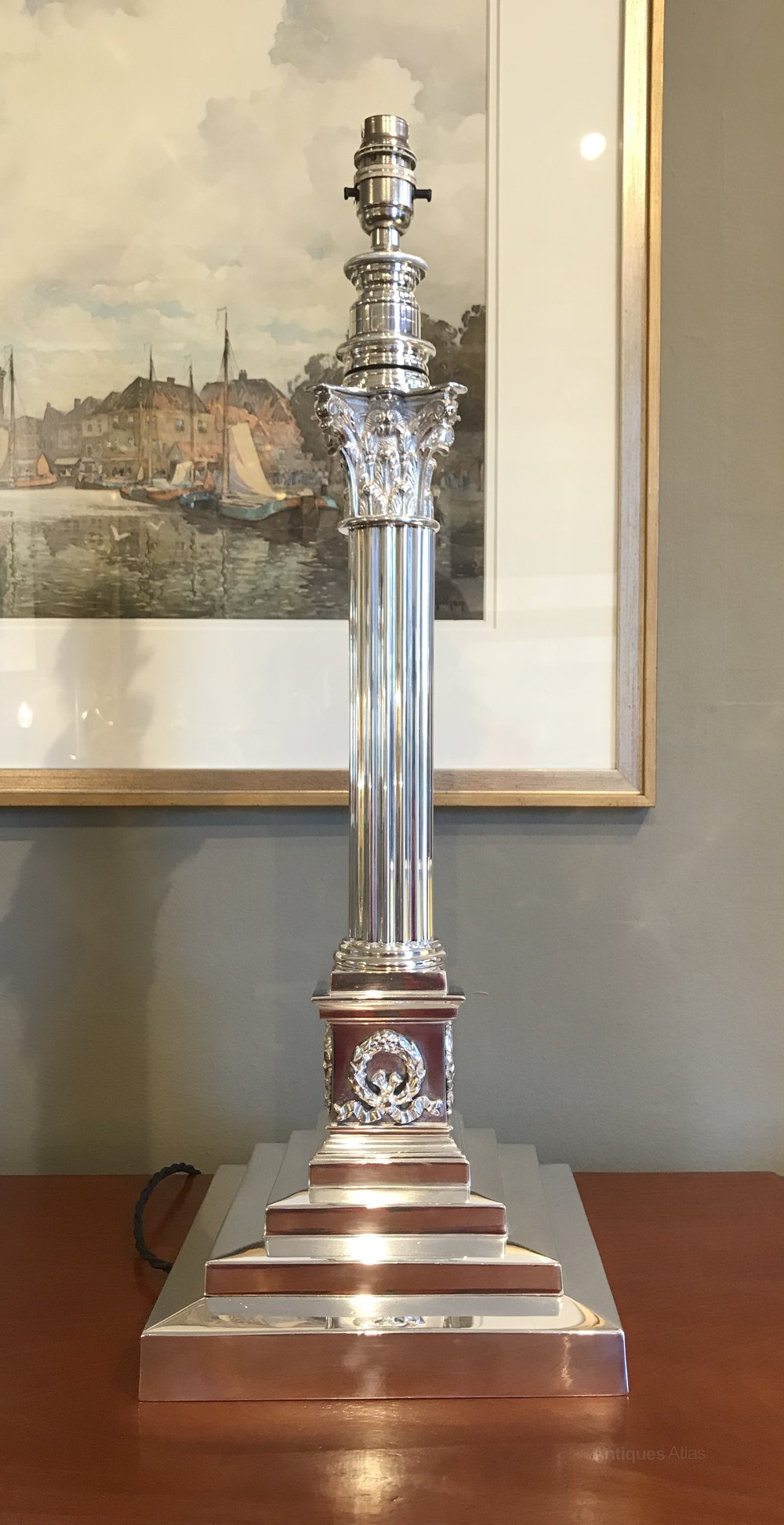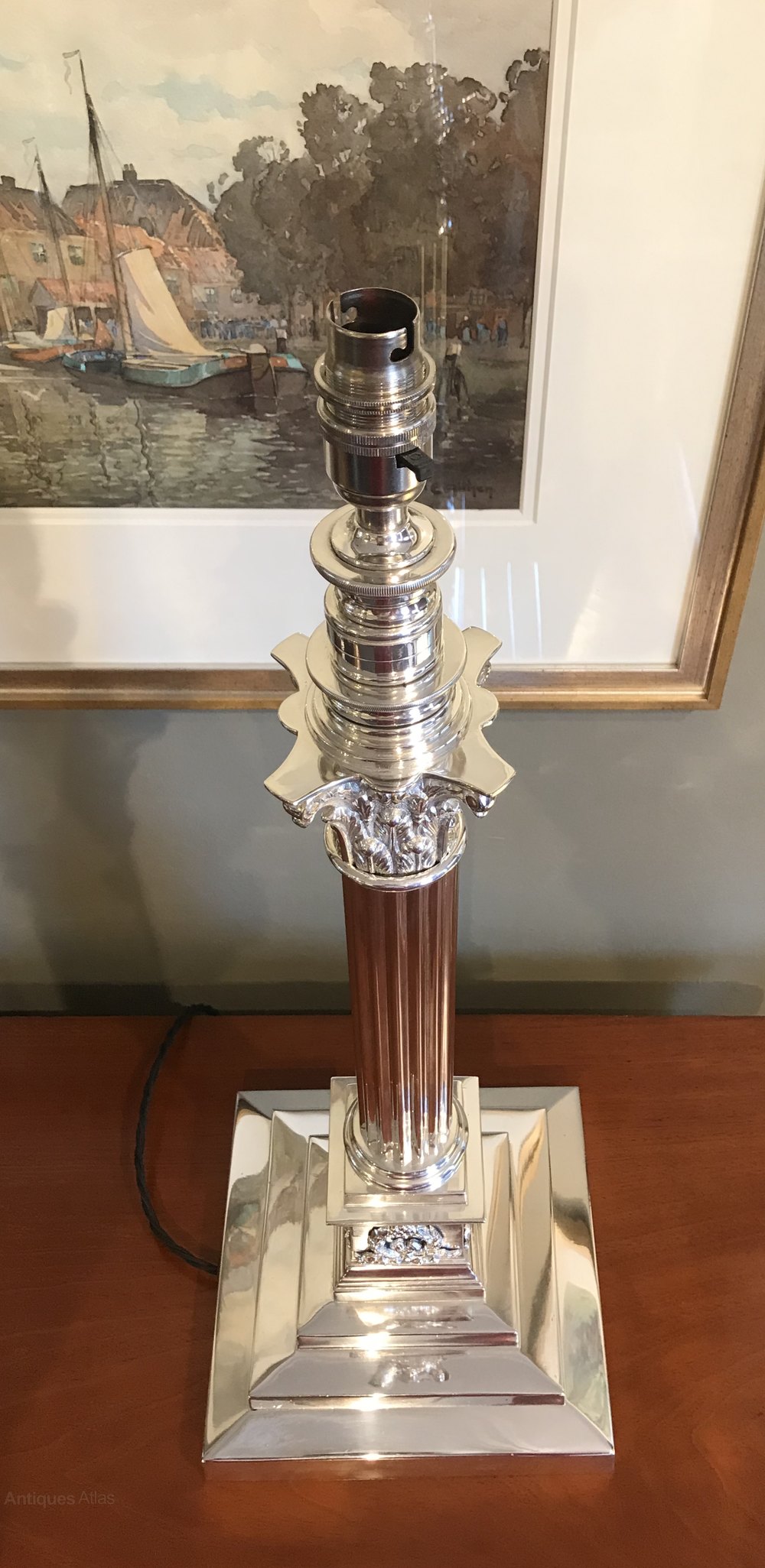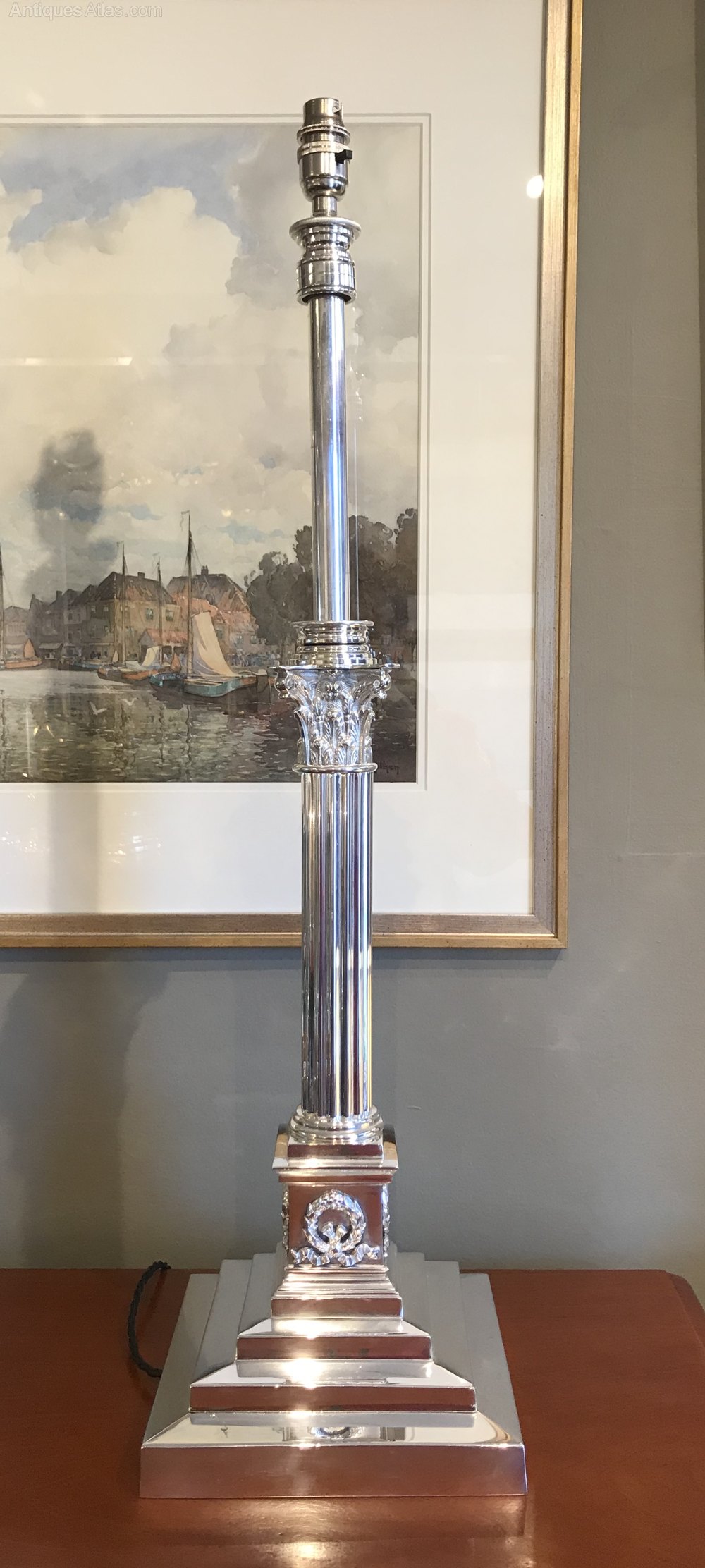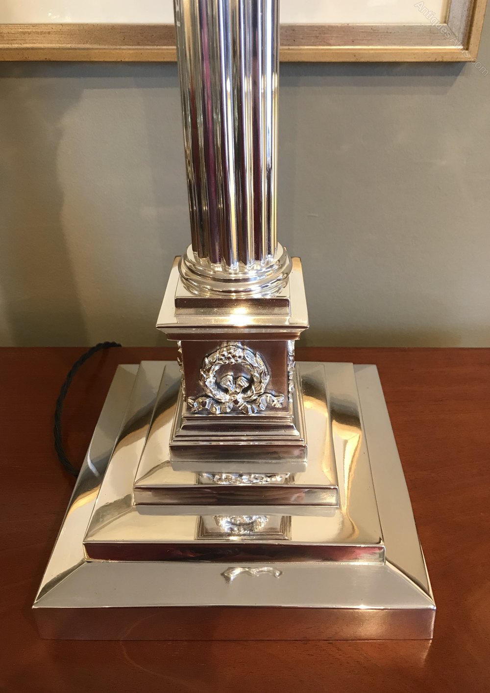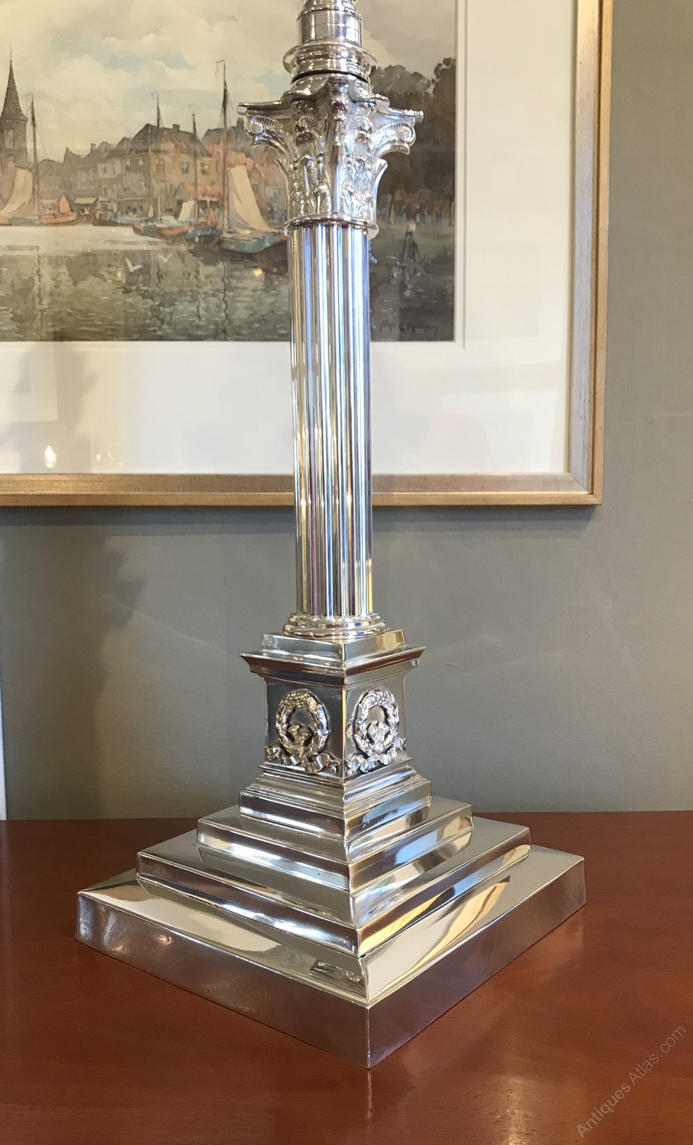 This impressive lamp with stepped base leading to Corinthian column and capital measures 59cm in height to the top of the bulb holder, however this lamp features an unusual telescopic column lifting the bulb holder a further 20cm if so desired. The three step base measures 20.6cm x 20.6cm.