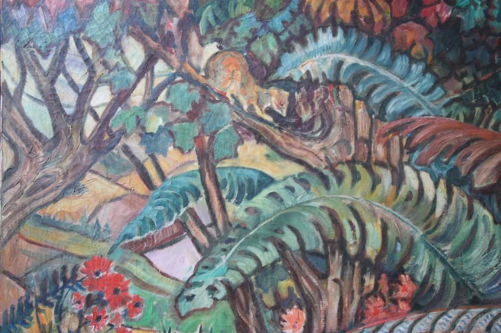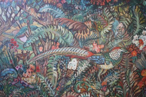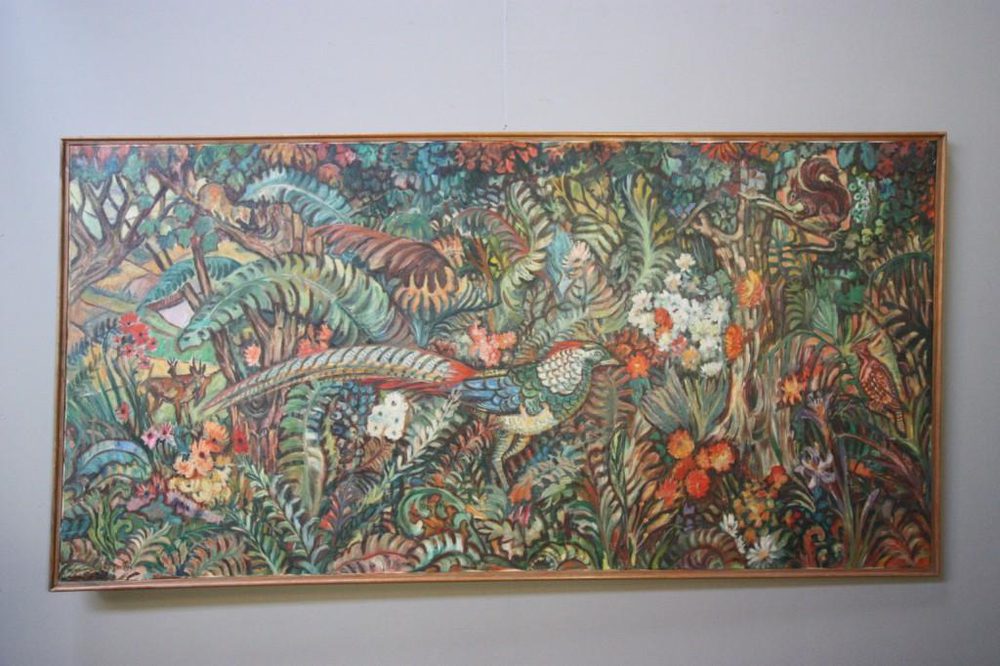 Artist M. Van de Catsyen. Titled on reverse 'Composition Florale au Faisan' 1968.