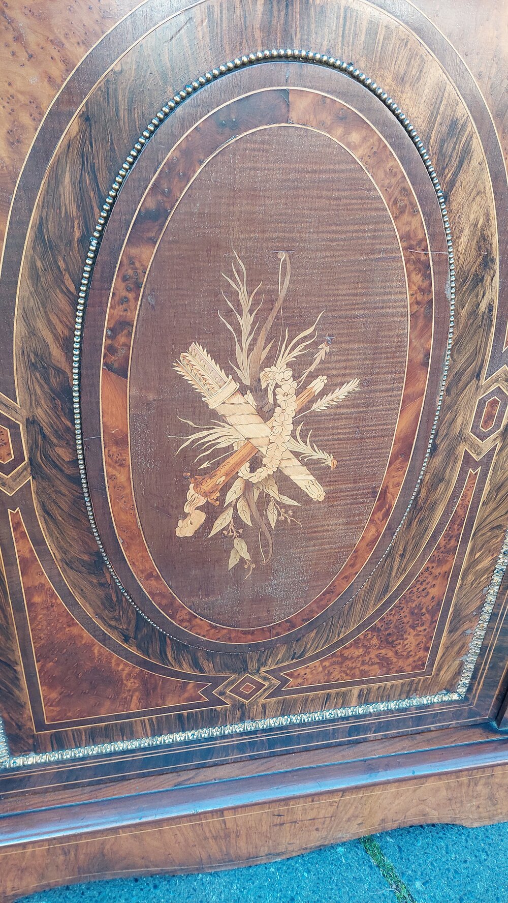 Large Marquetry Inlaid Walnut Bombe Shaped Cabinet