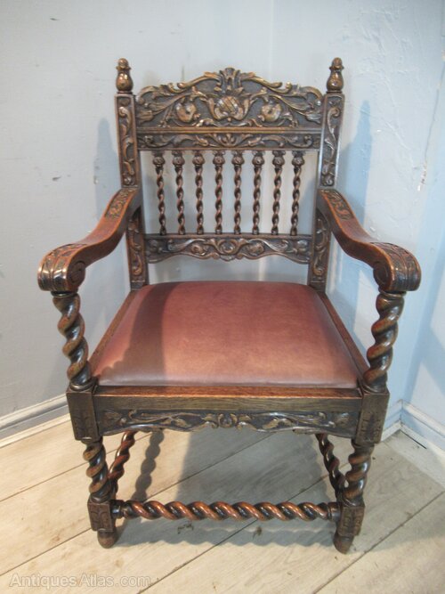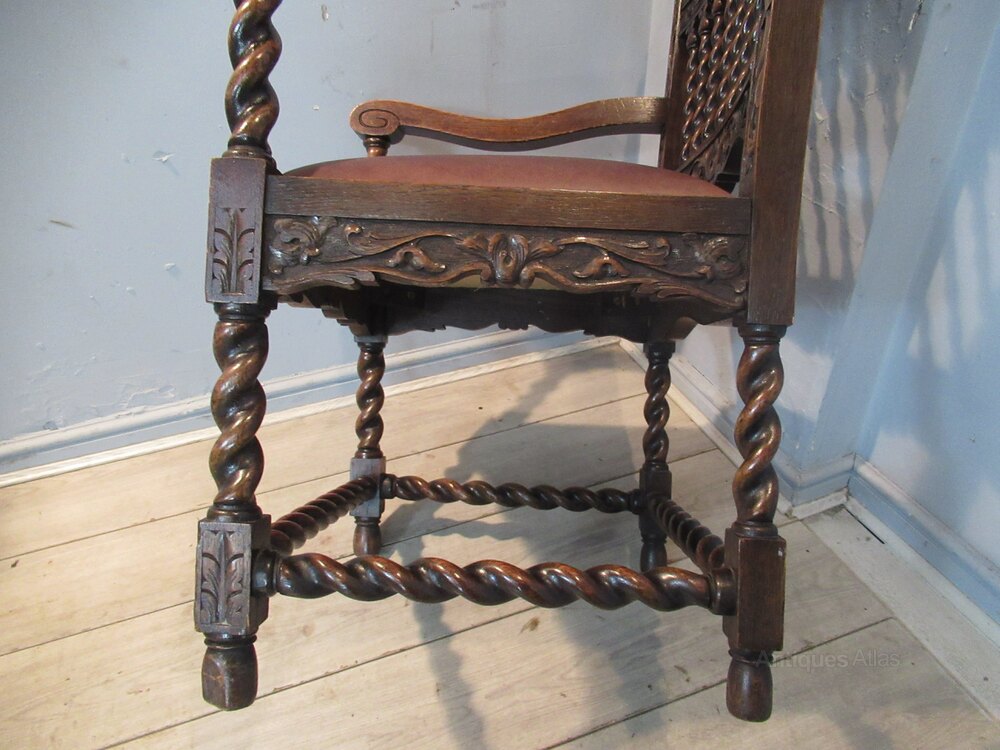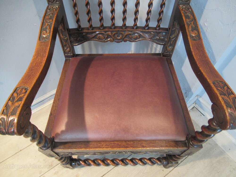 Late Victorian carved oak arm chair, with a shaped and carved back rest, shaped arms . The arms have a barley twist support, legs and lower cross stretchers The chair has a drop in seat.