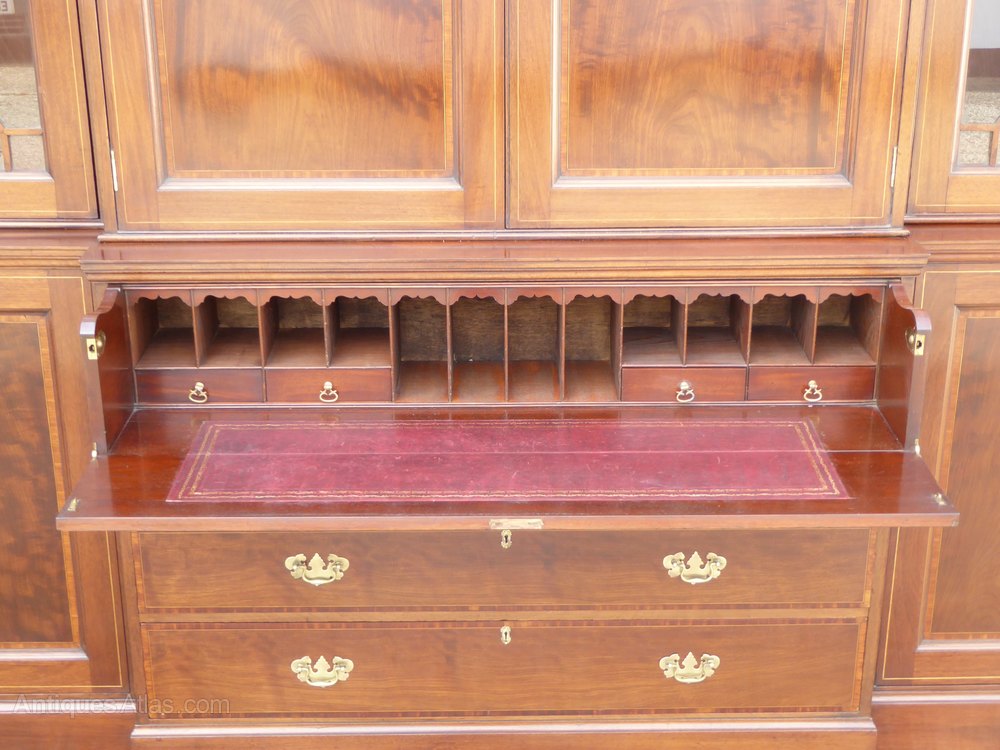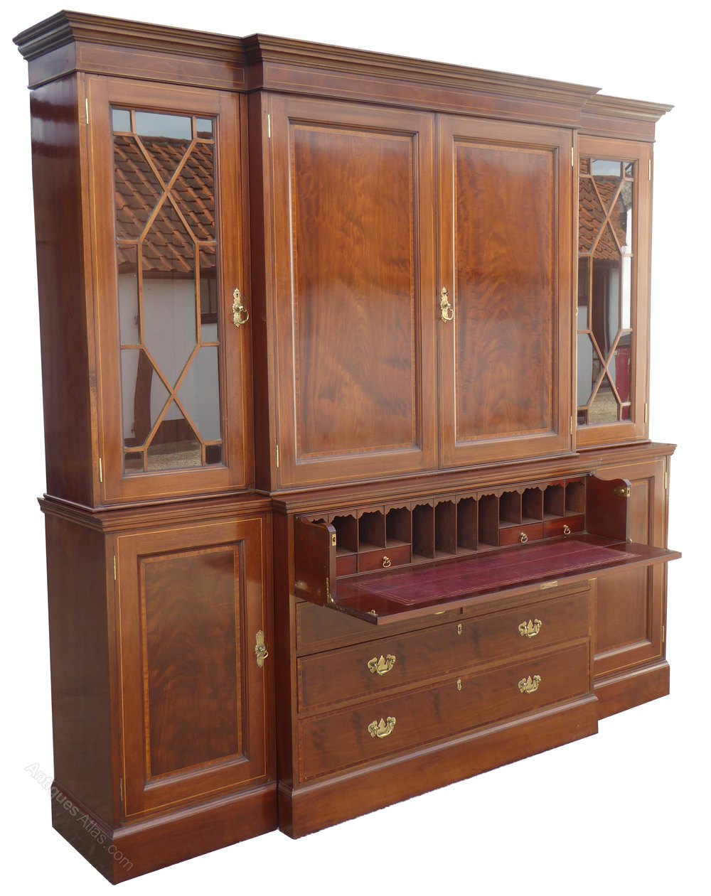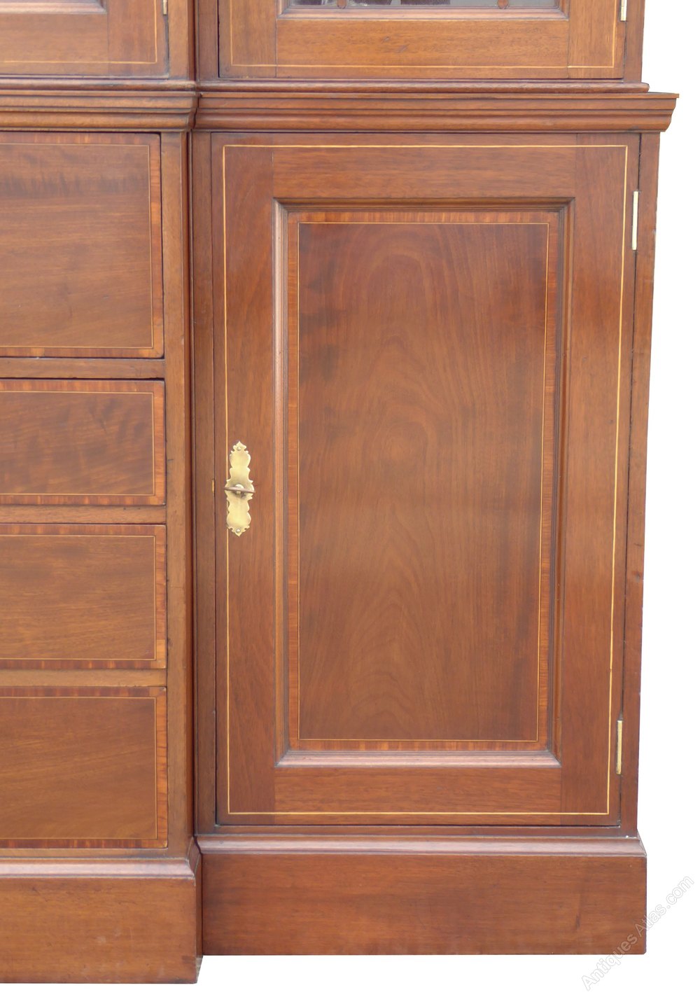 For sale is a good quality Late Victorian/ Edwardian Breakfront Bookcase. The top of the bookcase has a flared cornice above four doors. Each end door is glazed, opening to reveal adjustable shelves. The two centre doors are paneled, also opening to reveal adjustable shelves. Below this, the centre section has an arrangement of five drawers, with a secretair drawer at the top, opening to display a fully fitted interior comprising of a leather writing surfaqce, drawers and pigeon holes. This is above two short drawers over a further two graduated drawers. The bookcase stands on a plinth base and comes apart into seven pieces for ease of transport. The bookcase is in very good condition having been completely re-polished by hand.