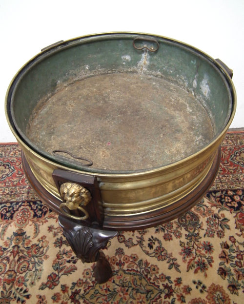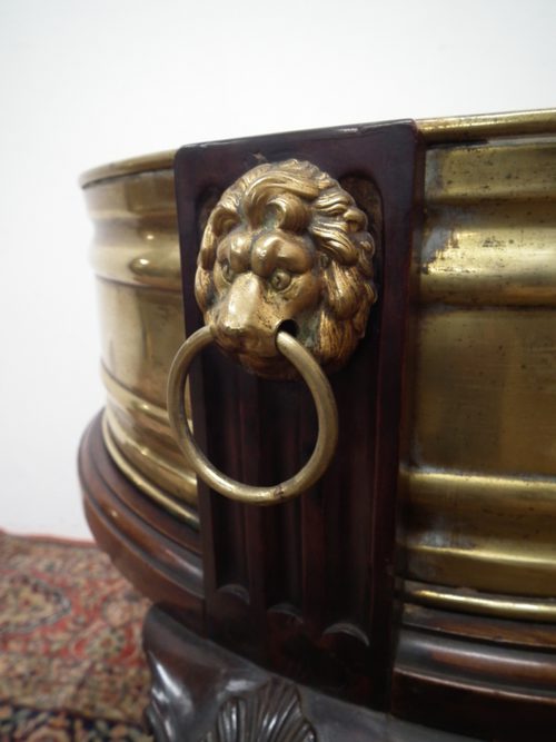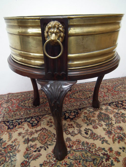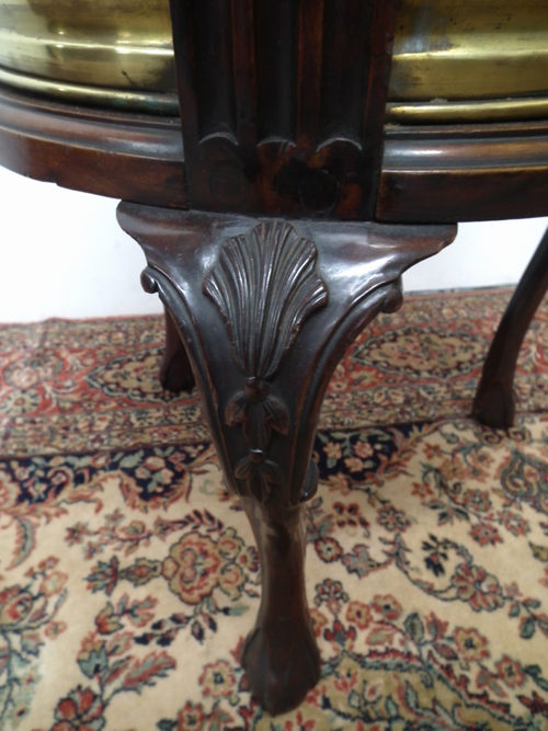 Late Victorian mahogany and brass jardinière, with a circular moulded brass insert supported and encased in a mahogany stand. The uprights of the stand have lion mask handles, and below this is a moulded frieze and 3 cabriole legs with carved knees finishing in a ball and claw foot. The jardinière also has an insert of a waterproof liner.