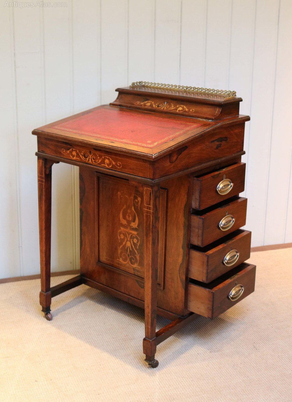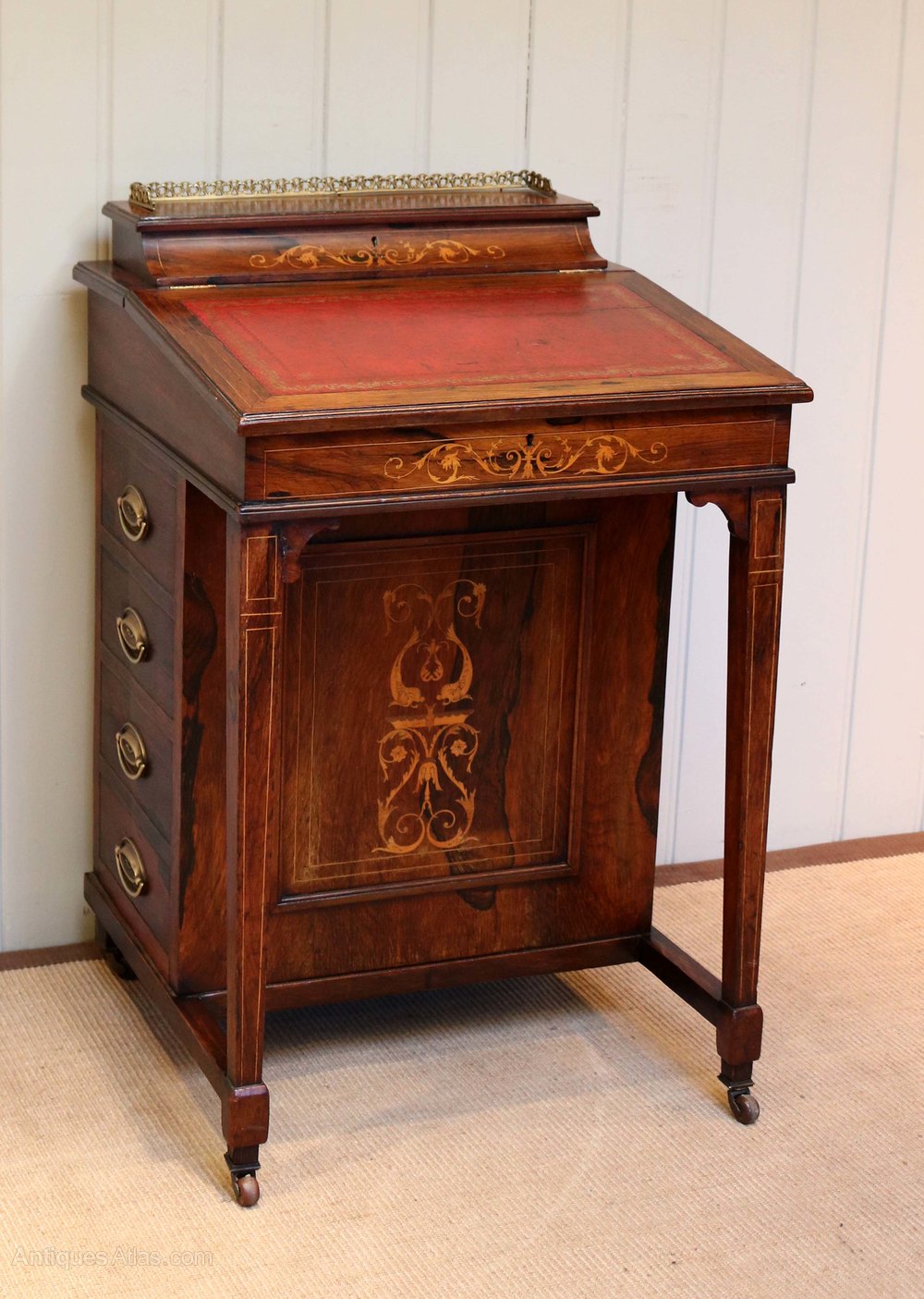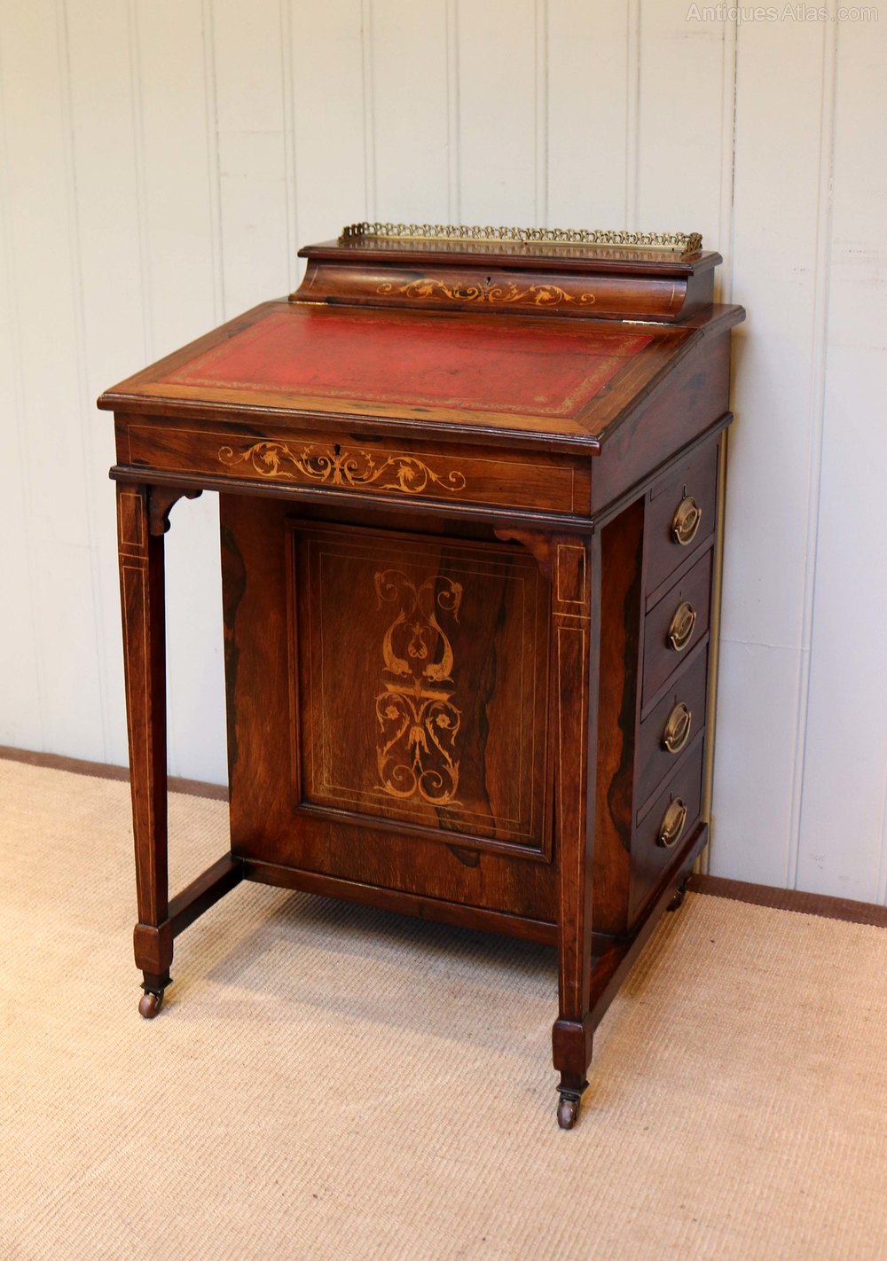 Late Victorian rosewood inlaid davenport, having a brass galleried top with a lift up lid enclosing a stationary storage compartment, a sloping leather writing surface opening to reveal a fitted interior above a set of four drawers with dummy drawers to the other side raised on straight tapering legs.