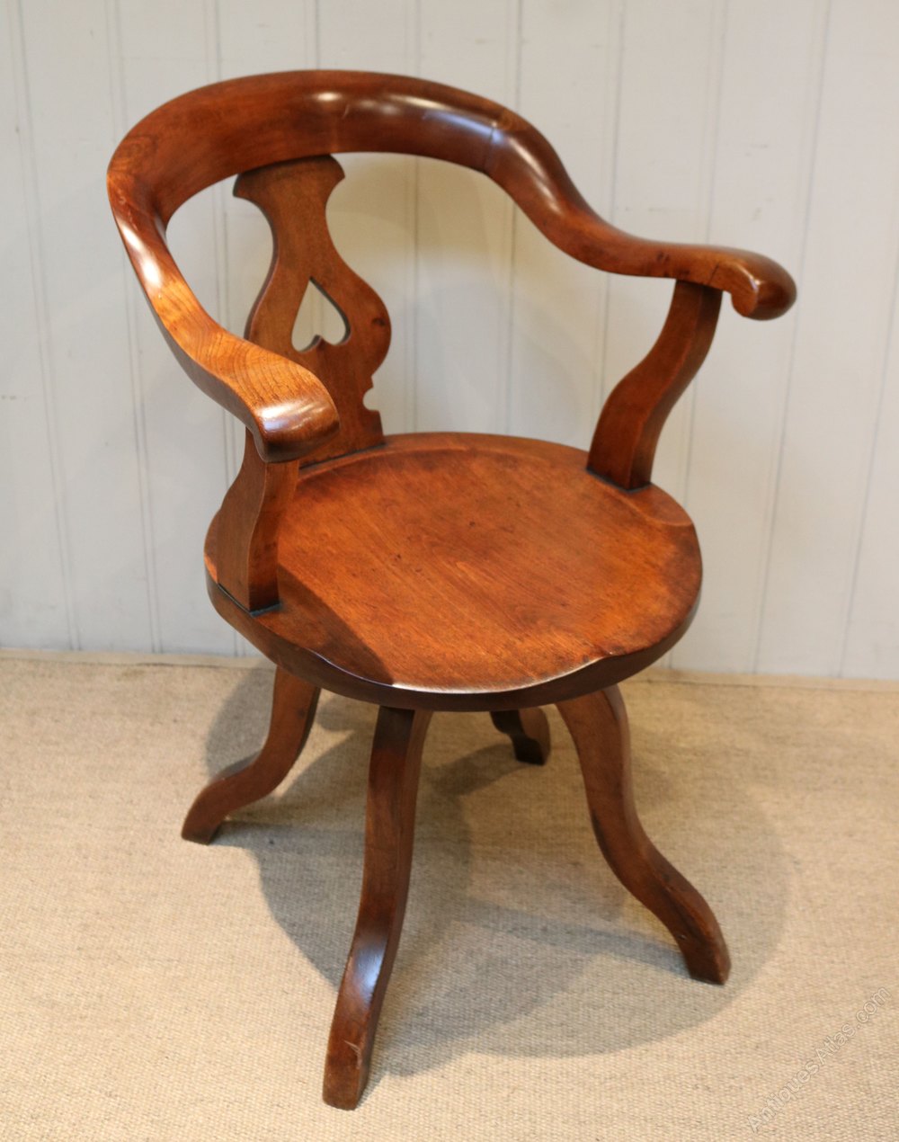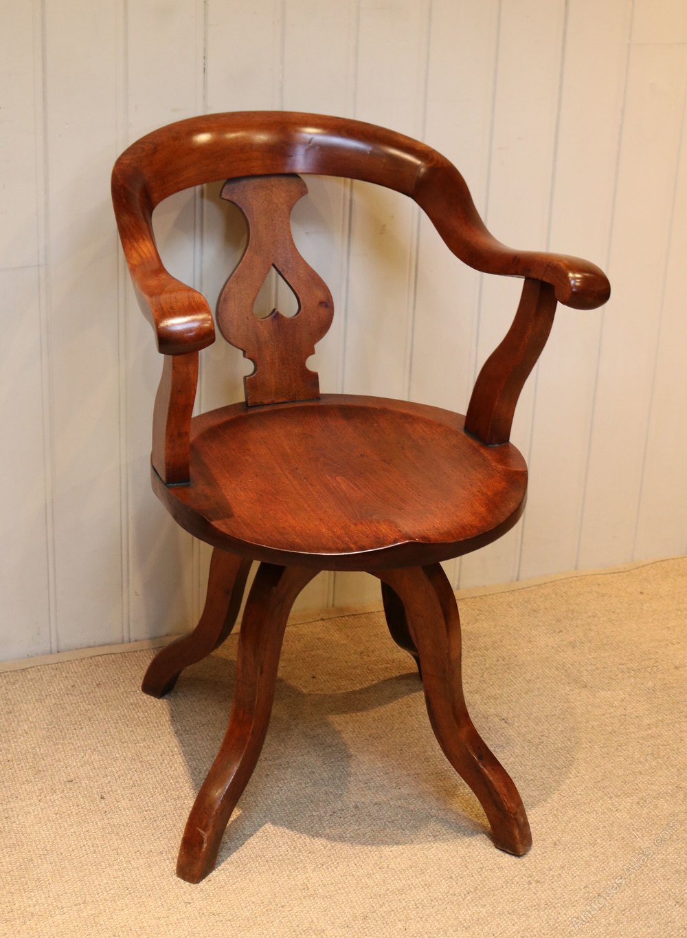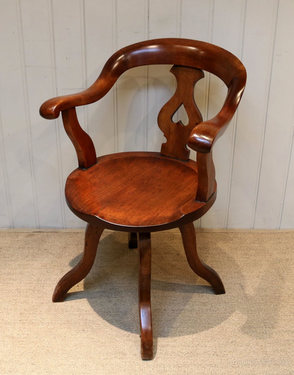 Late Victorian Walnut revolving desk chair having an elegant curved back bar with a central pierced heart back splat and down swept arms, a generous saddle form seat raised on shaped splayed legs