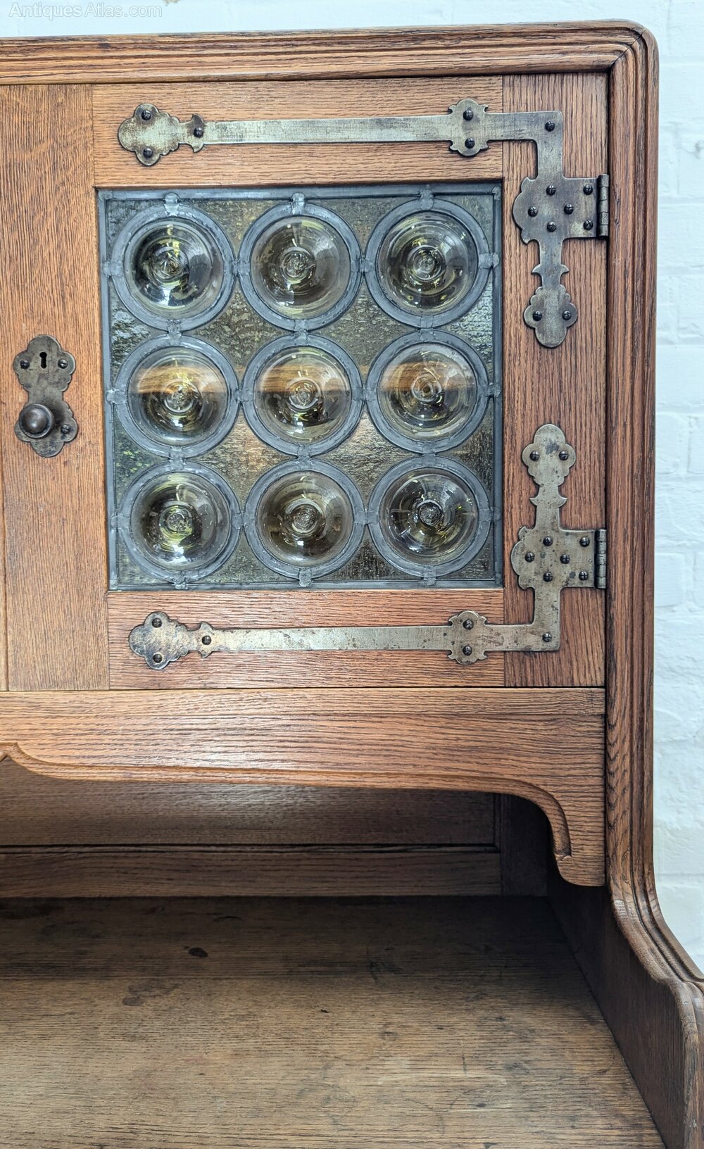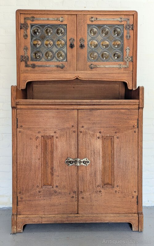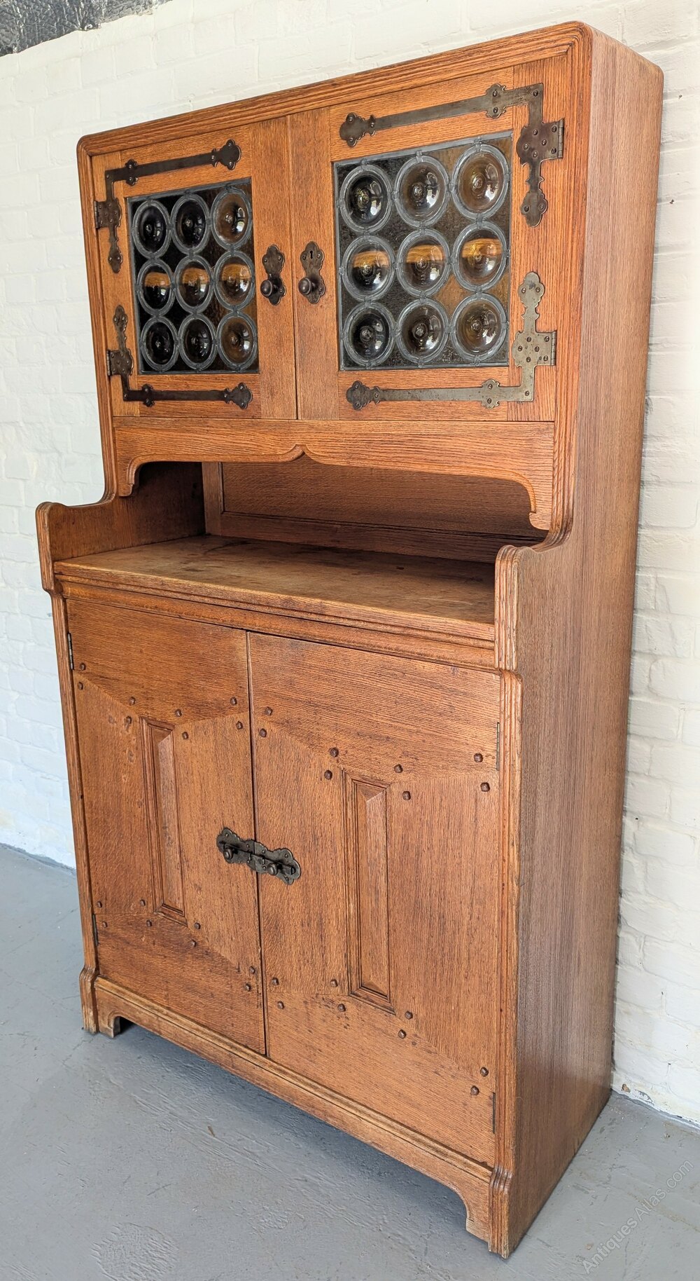 A beautifully constructed Liberty oak dresser with steel hinges and lock and leaded bottle glass upper doors in used condition measuring 196 cm x 46 x 88. Labeled on the back.